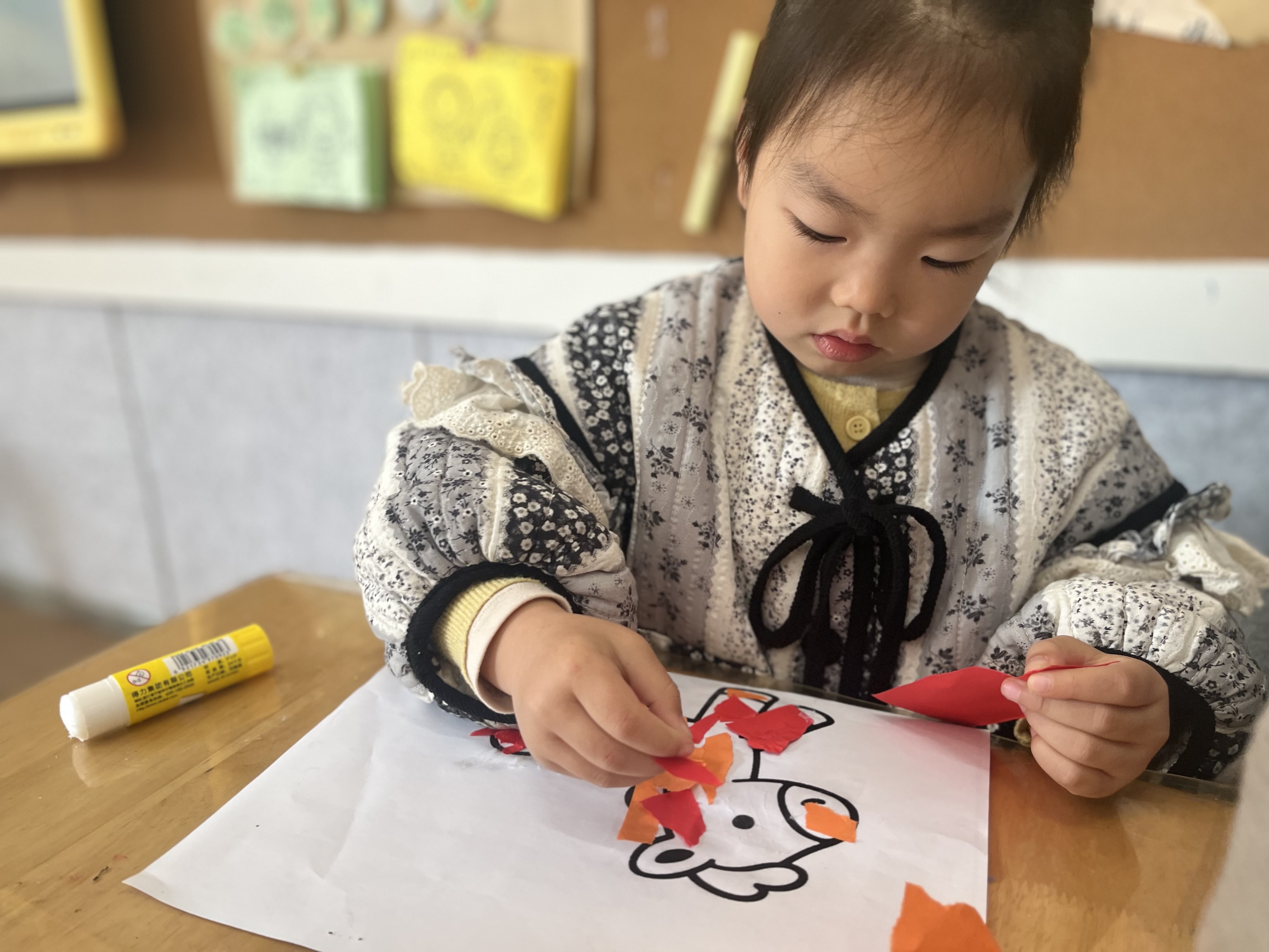 在充满暖意的教室里,兰亭中心幼儿园小三班的宝贝正全神贯注地进行着撕纸贴画,宝贝用小手把彩纸撕成碎片,仔细地贴在画纸上的小马轮廓上。红与橙的色块在指尖跳跃,一点点为这只小马增添新年的喜庆色彩。专注的神情、认真的模样,都藏着她对新年的期待。这不仅是一次手工创作,更是孩子用自己的方式迎接马年的到来。小小的彩纸在指尖变成了满满的年味,也让我们看到了宝贝的耐心与创意。