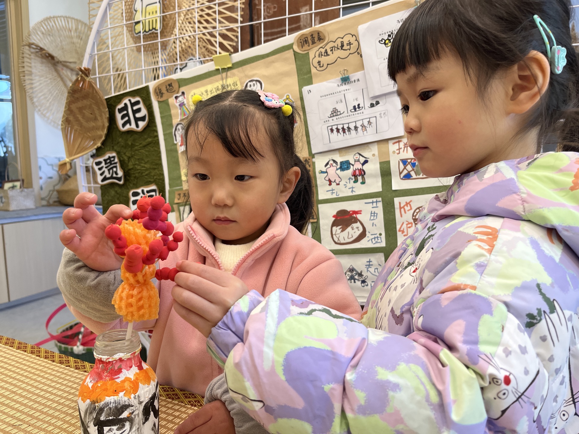 在兰亭中心幼儿园小三班的教室里,两个宝贝正专注地合作着手中的创意手工。她们用橙红两色的材料,精心装饰出一串充满年味的“糖葫芦”造型。 小手稳稳捏着材料,眼神里满是认真与专注,仿佛在雕琢一件独一无二的新年礼物。在这个充满童趣的创作过程中,不仅锻炼了她们的动手能力,更让孩子们在合作中体会到分享的快乐。 这是小三班宝贝们迎接马年的独特方式,用稚嫩的小手,把对新年的期待和祝福,一点点揉进了温暖的作品里。