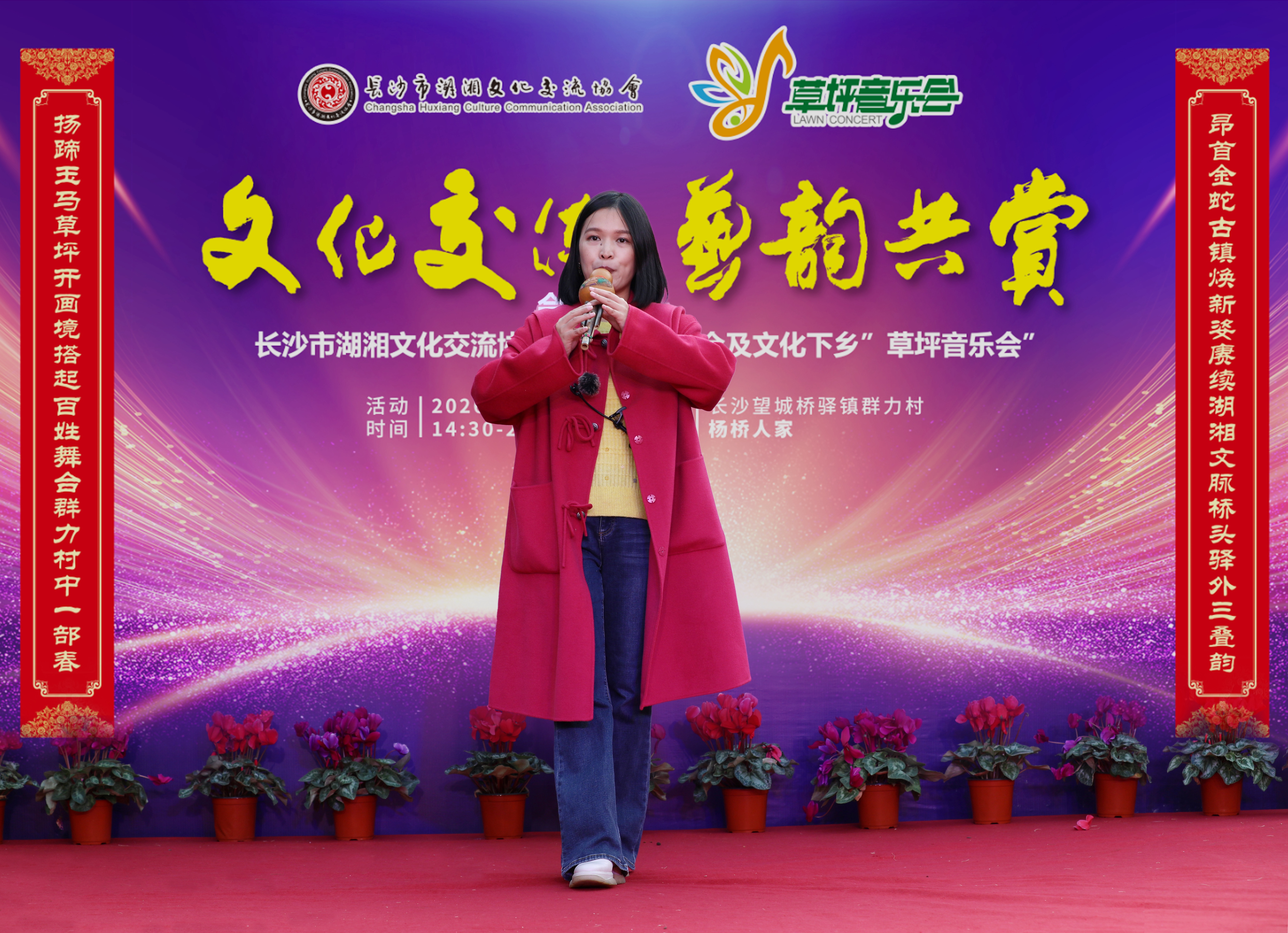 湖湘文化绘春景,文化赋能暖乡村 ——长沙市湖湘文化交流协会2025年度年会 暨“草坪音乐会”成功举办 (图/文 洪艳)2026年1月28日,由长沙市湖湘文化交流协会主办的2025年度年会暨文化下乡“草坪音乐会”在望城群力村“杨桥人家”温情启幕。本次活动得到有关领导、桥驿镇党委政府及群力村村支两委的大力支持。著名文史学家陈先枢教授、湖南省人社厅原党组书记、厅长彭崇谷,湖南省直书画家协会主席覃小平,长沙市政协原党组书记、主席、协会创始会长董学生,市直机关单位老领导曾正国、邹志祥、陈玲瑯、江权度、胡岳龙、陈德益、胡润红。乡贤代表佘德义、桥驿镇党委书记谢立雄等300多人齐聚一堂,共度这场温暖乡土的美好时光。 会议由协会党支部书记廖铁主持,会长胡新闻通报了协会相关工作计划安排,副会长冯国平介绍了桥驿镇的风土人文。村民代表杨佳分享了当地红色故事《为了人民谋幸福》。 桥驿镇群力村是一片富含红色记忆的土地,孕育了周炳文等七位革命烈士,留存着长沙会战战壕等历史遗迹。选择在此举办文化活动,正是推动艺术下基层的有益尝试。,随着节目主持人杨岳森宣布音乐会开始,《小白杨》《阳光路上》等经典旋律陆续响起,萨克斯、古琴、竹笛等中西乐器交织共鸣,传统与现代在此和谐相融!本次文艺活动汇聚了长沙多位知名艺术家与协会艺术骨干参与。易冬贵、易朝伟、王佩群、周智艳、袁佩、李英、黄海林、李哲秀、何方、刘志强、黄兴、张明清、胡长生、王斯安、杨 芳、海洋、姚思雅等相继登台表演,通过歌曲、器乐、茶艺表演等多种形式,赢得观众阵阵掌声。 活动期间,艺术家彭崇谷、阳盛海、江权度、何仁诰、李再湘、廖铁、佘辉、叶卫平等还进行了现场挥毫,为村民写春联送祝福。最后,董学生为长沙市湖湘文化交流协会茶文化专业委员会的正式成立向主任刘湘授牌。