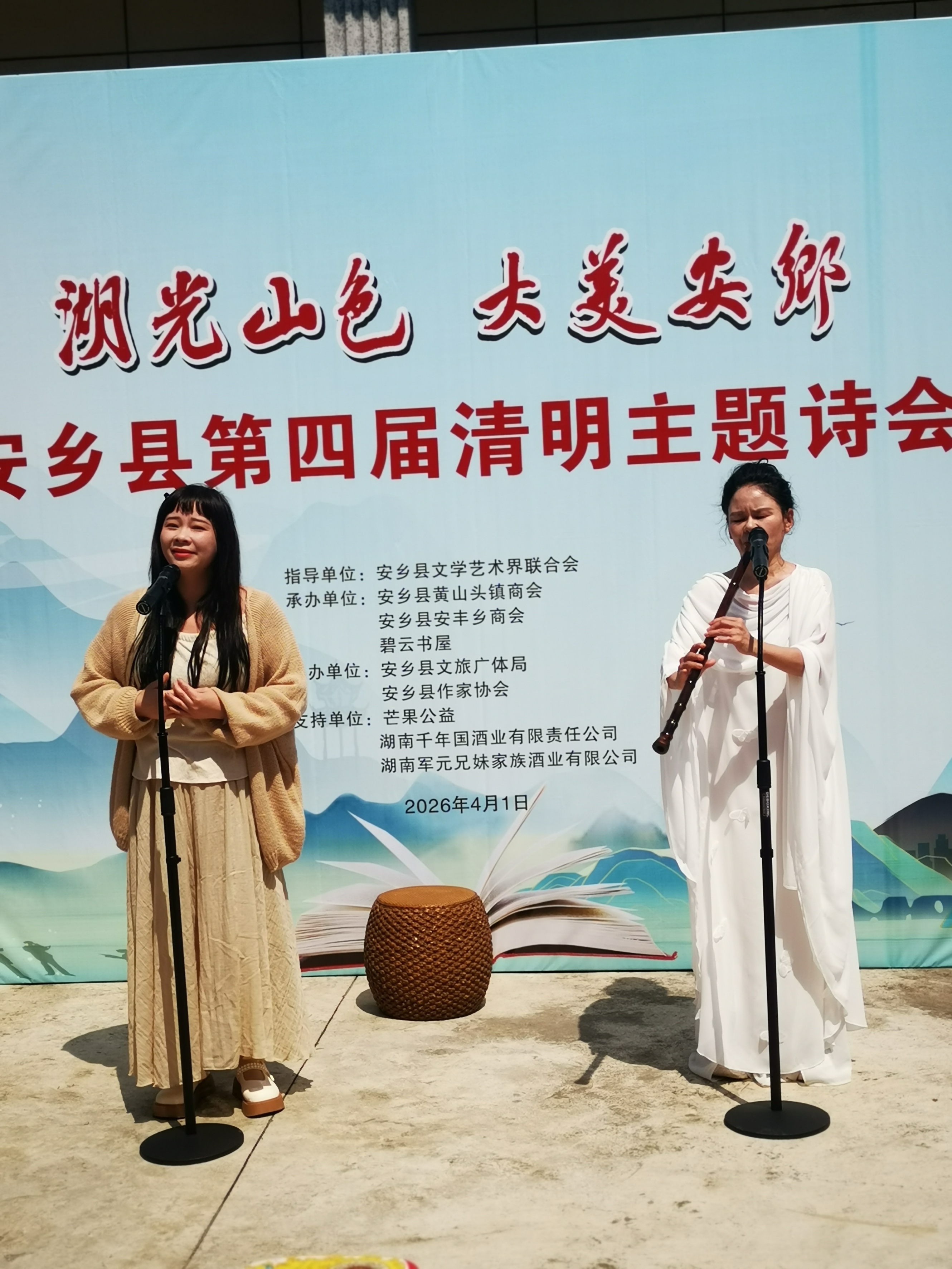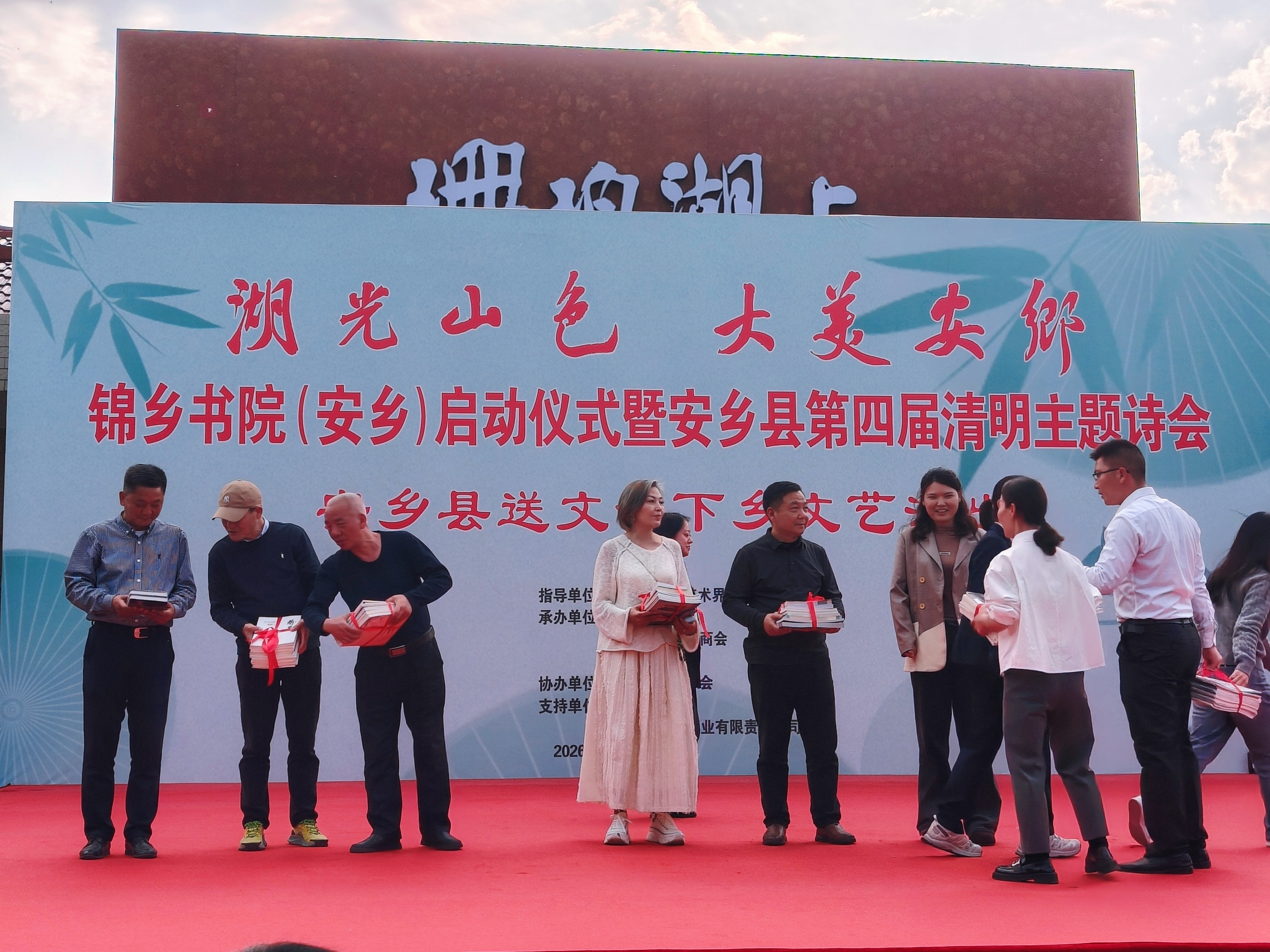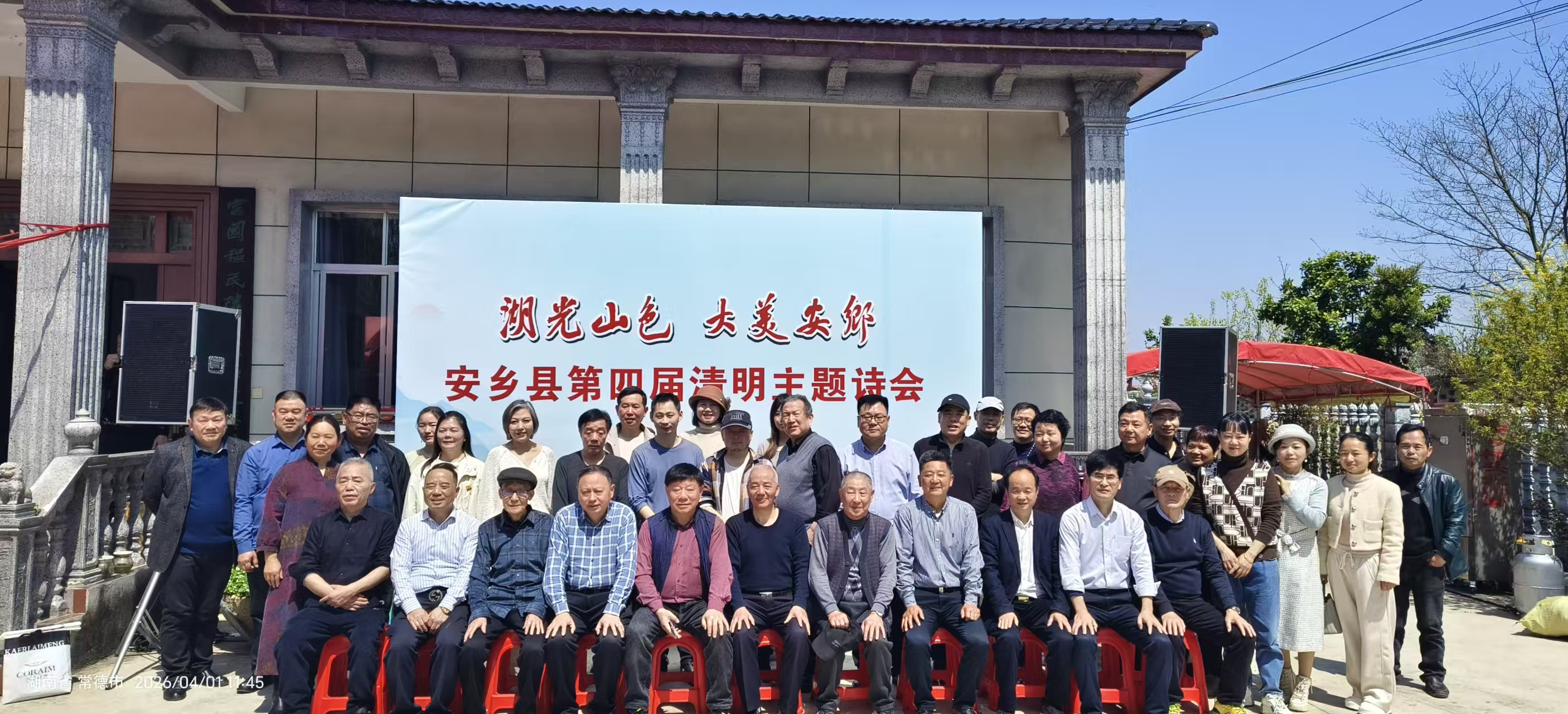 安乡县举行第四届清明诗会 (图/文 周艳梅)4月1日,“湖光山色 大美安乡”安乡县第四届清明诗会在黄山头镇黄土堤村碧云书屋隆重举行。这次活动由安乡县文学艺术界联合会指导,黄山头镇商会、安丰乡商会、碧云书屋联合承办,湖南省党史办原主任张志初、湖南省工业职院原院长向罗生等来自省市县的作家艺术家一百余人参加了这一盛会。活动以诗画为媒传承传统文化,以书院为基助力乡村振兴,为安乡“诗词之乡”“长寿之乡”“酱卤之乡”建设添彩赋能。 活动在湘鄂边界的黄山头镇碧云书屋启幕。诗会现场,优美的诗歌朗诵与火焰笛箫馆的文艺演出轮番上演,书画家们现场挥毫泼墨,笔墨间尽绘黄山头的山水之美与安乡的人文底蕴,传统文化在融融春日焕发出新的生机。 随后与会人员参观了颜昌颐故居,张志初、刘飞同志向烈士敬献花篮并整理绶带,全体人员鞠躬致敬、敬献鲜花。 在锦乡书院(安乡)启动仪式上。安乡县委常委、县人民政府副县长、安丰乡党委书记为书院发起人周文波授牌。 此次活动融合了黄山头镇的历史人文、安丰乡的红色底蕴与珊珀湖的生态之美,以诗会为纽带串联了两地特色,为安乡以文化赋能乡村振兴、推动文旅融合发展写下了生动注脚。活动既是安乡对中华优秀传统文化的传承与弘扬,也是当地探索文化助力乡村振兴的新实践。未来,安乡持续开展各类文化活动,让文化之美浸润湖光山色,让书香之气滋养大美安乡,为县域经济高质量发展注入源源不断的文化动力。