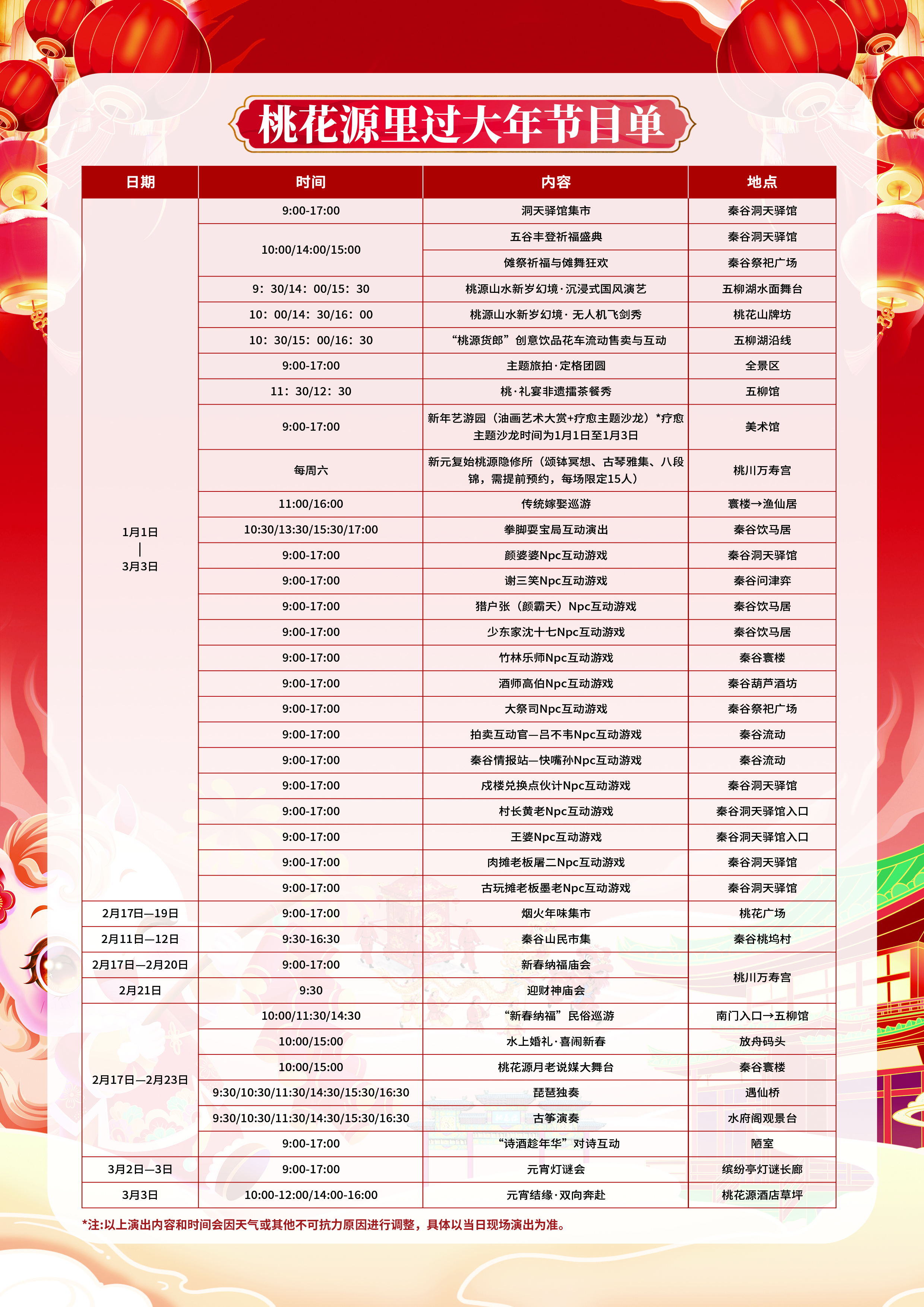 #桃花源里过大年#79元解锁桃花源里的中国年|常德文旅邀你赴一场千年古风之约✨ 当腊月的风拂过秦溪,常德桃花源便换上了最浓的年装。2026年1月1日至3月3日,“桃花源里过大年”文旅盛宴重磅启幕,79元一票全享,让你沉浸式穿越回那个“土地平旷,屋舍俨然”的世外桃源,解锁最地道的中国年味儿。 - 游:含景区门票、秦溪游船体验券、观光车票,泛舟秦溪,看两岸桃花与红灯笼相映成趣。 - 购:40元代金券可在景区内置换文创礼品、住宿或餐饮,把桃花源的年味带回家。 - 吃:非遗擂茶餐秀、茶树林茶宴、山民市集小吃,从舌尖感受常德的烟火气。 - 行:全程观光车接驳,轻松打卡核心景点,不必为路途奔波。