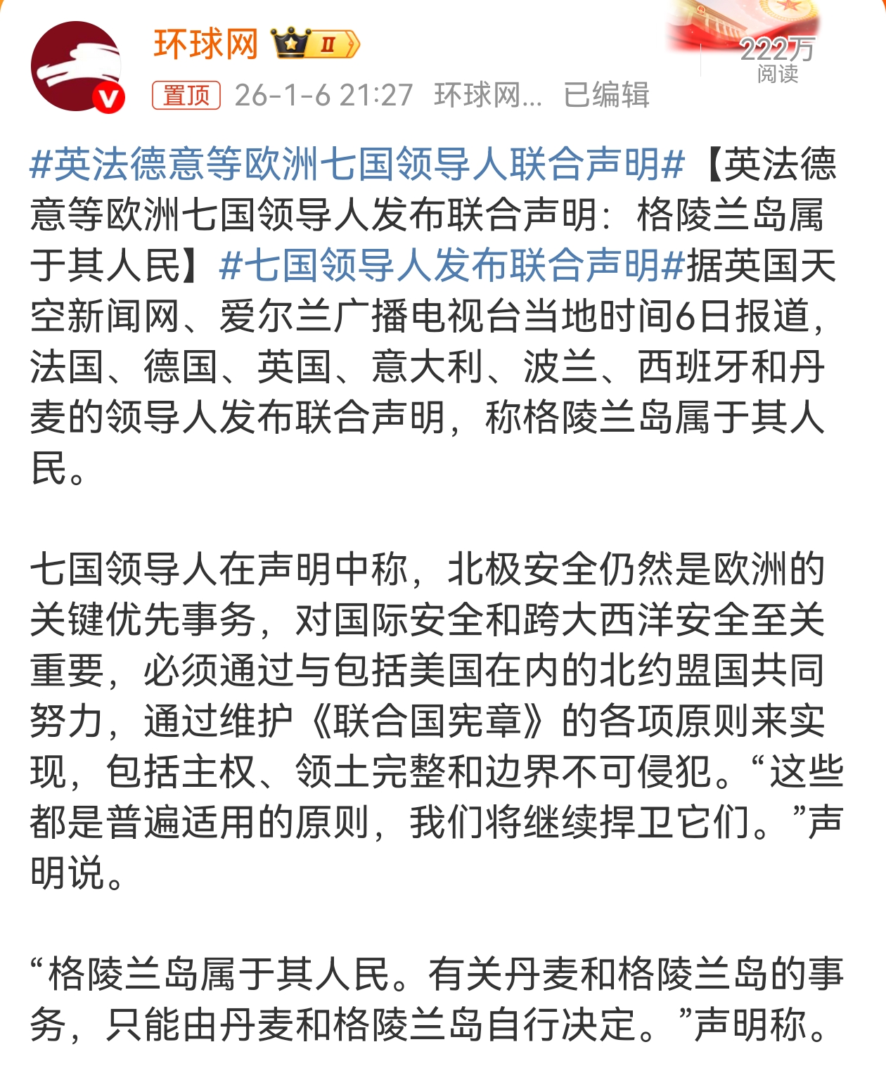 #英法德意等欧洲七国领导人联合声明# 欧洲七国领导人联合声明称格陵兰岛属于其人民,有关丹麦和格陵兰岛的事务,只能由丹麦和格陵兰岛自行决定。 那委内瑞拉呢?委内瑞拉就不属于其人民了嘛,就不是由委内瑞拉自行决定的吗? 标榜民主自由的西方国家哦,一些国家开始绑架和掠夺,一些则开始装聋作哑。 欧洲多国对格陵兰岛事务发表声明,也是因为北极安全对于欧洲的重要性,关键还事关欧洲最后的一点颜面,虽然是一再被美国践踏。 欧洲还说,必须通过与包括美国在内的北约盟国共同努力,通过维护《联合国宪章》的各项原则来实现,包括主权、领土完整和边界不可侵犯。 看欧洲这一副眼神躲闪、小心翼翼的模样!怪不得大漂亮对它们予取予夺,丝毫不顾及它们的感受!
