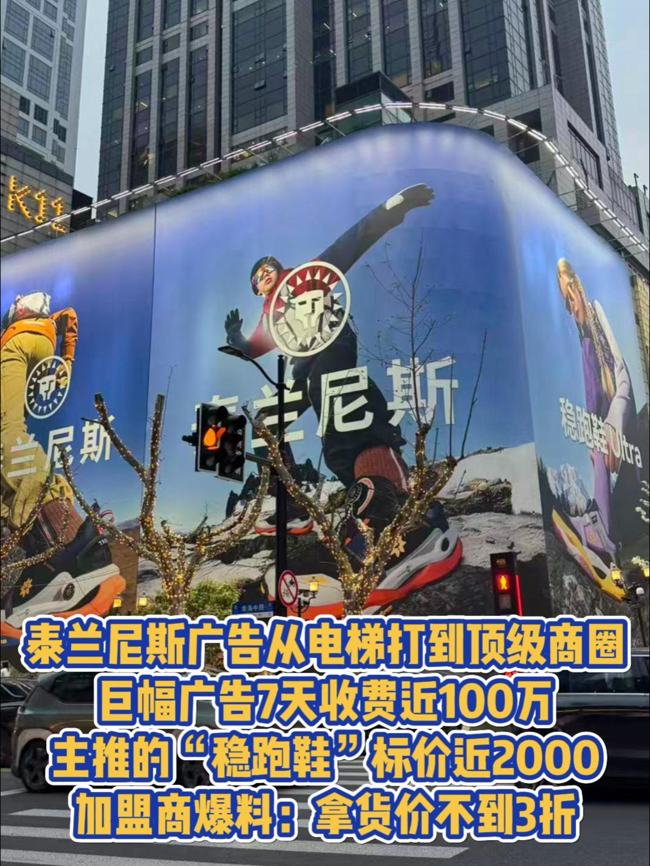 泰兰尼斯广告从电梯打到顶级商圈,巨幅广告7天收费近100万,主推的“稳跑鞋”标价近2000,加盟商爆料:拿货价不到3折