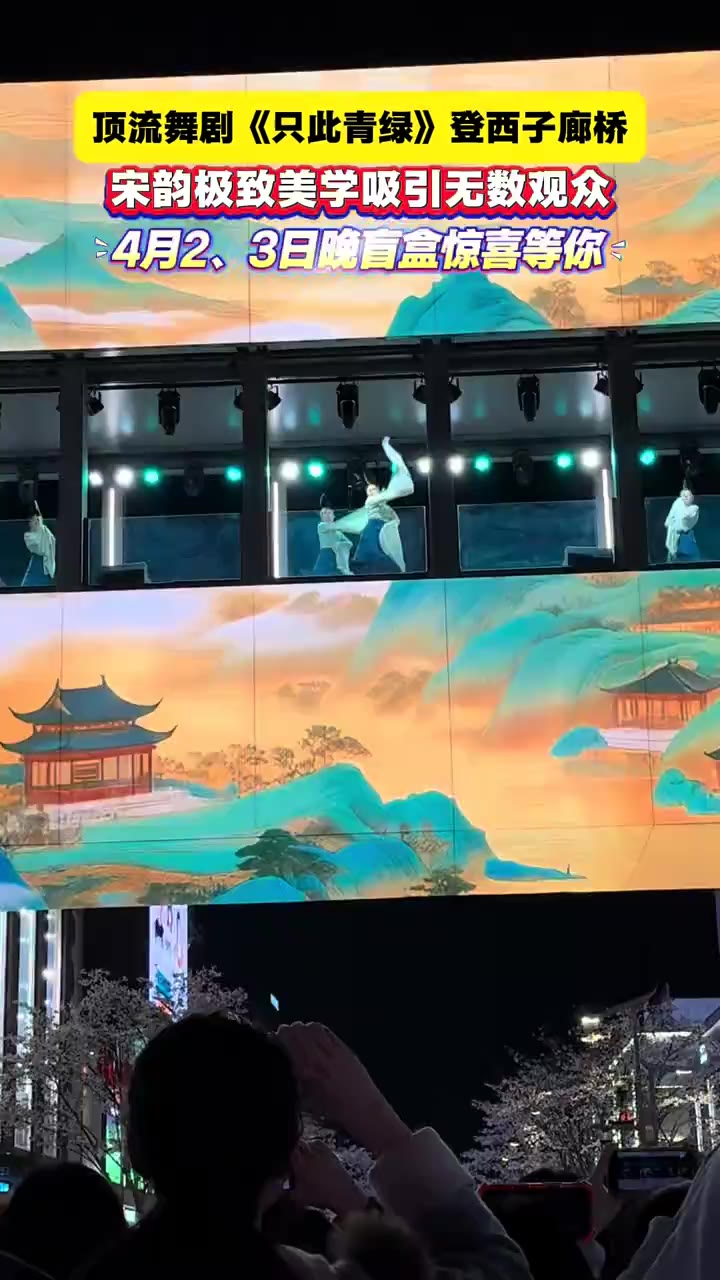 高空看舞剧《只此青绿》顶流舞剧《只此青绿》登陆西子廊桥,再现《千里江山图》的宋风雅韵,文艺赋美盲盒音乐会惊喜不断,4月2、3日童谣寻声+骏马驰骋