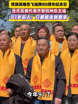 民族英雄岳飞诞辰923周年纪念日,91岁岳飞后人:只要能走就要来,民族英雄岳飞诞辰923周年纪念日,岳氏后裔代表齐聚杭州岳王庙,缅怀祖先更要传承精神