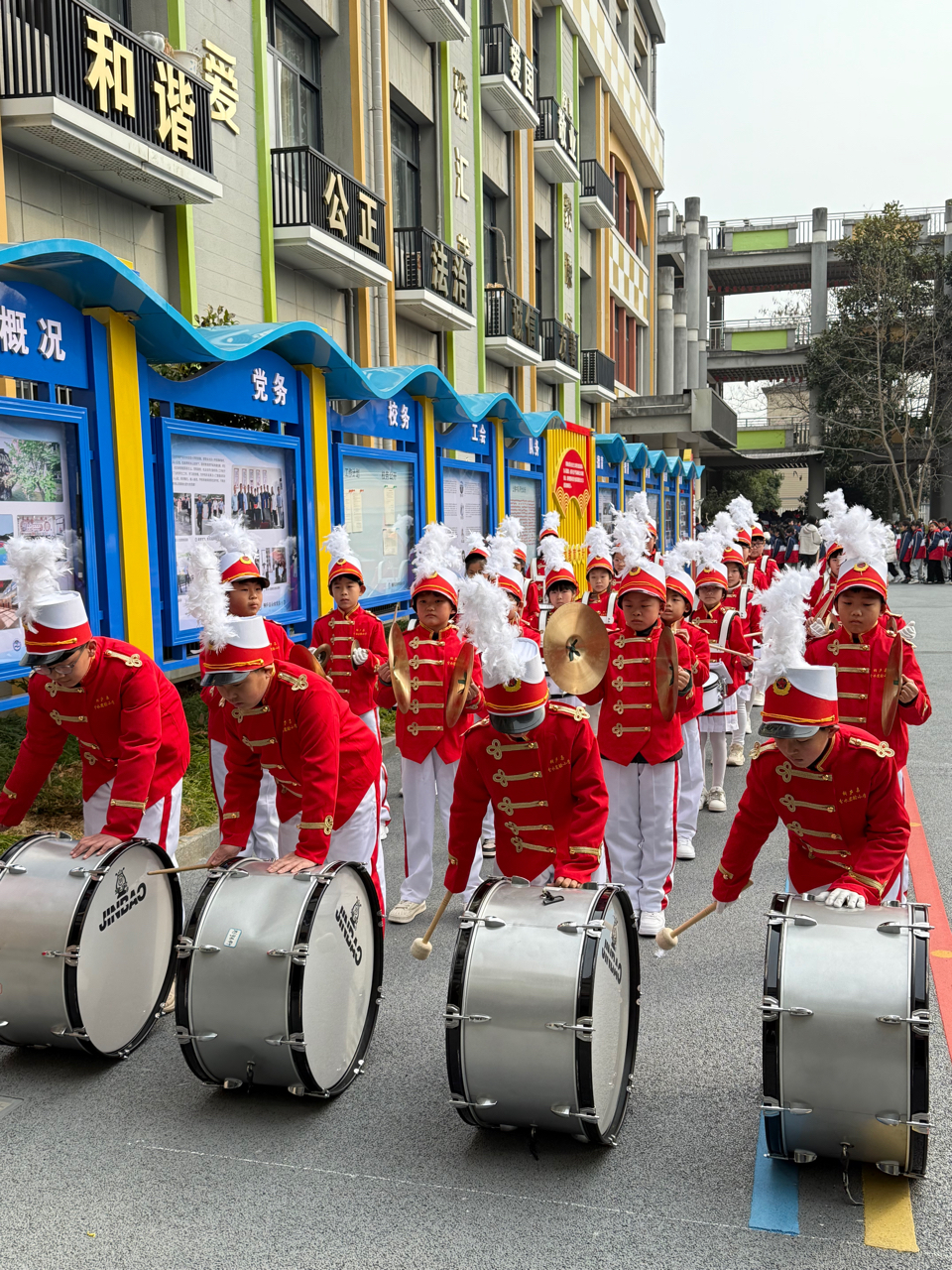 学校鼓乐队,红色制服白色羽帽超吸睛!鼓手敲击大型鼓,铙钹齐鸣,校园文化墙上,和谐公正的字样映衬着青春活力。
