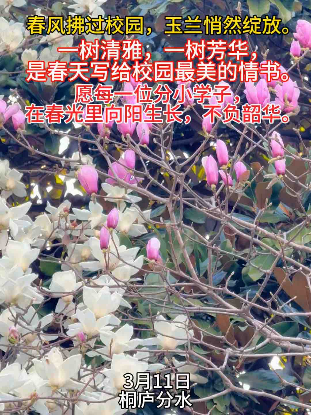 春风拂过校园, 玉兰悄然绽放。 一树清雅,一树芳华, 是春天写给校园最美的情书。 愿每一位分小学子, 在春光里向阳生长,不负韶华。