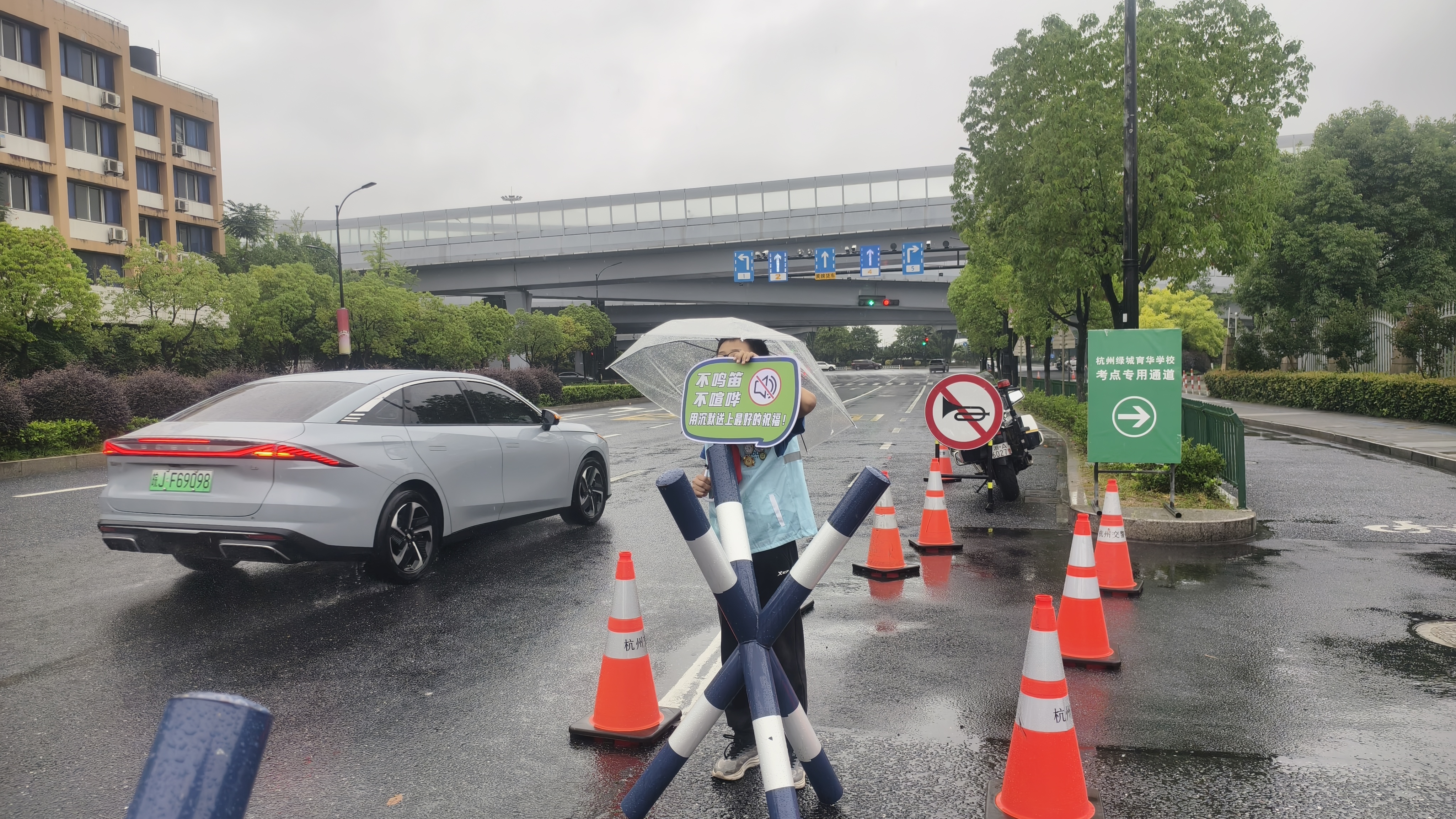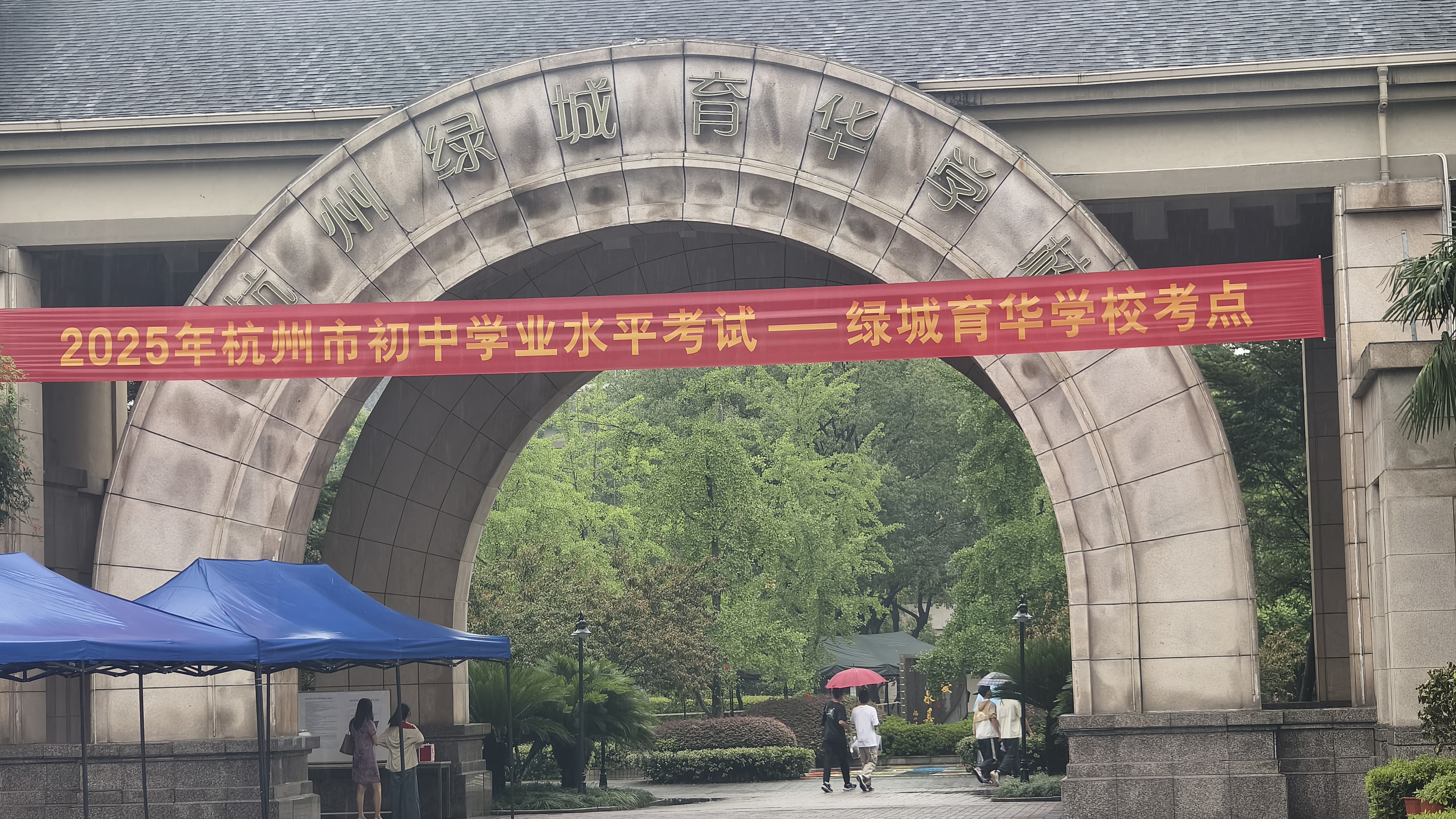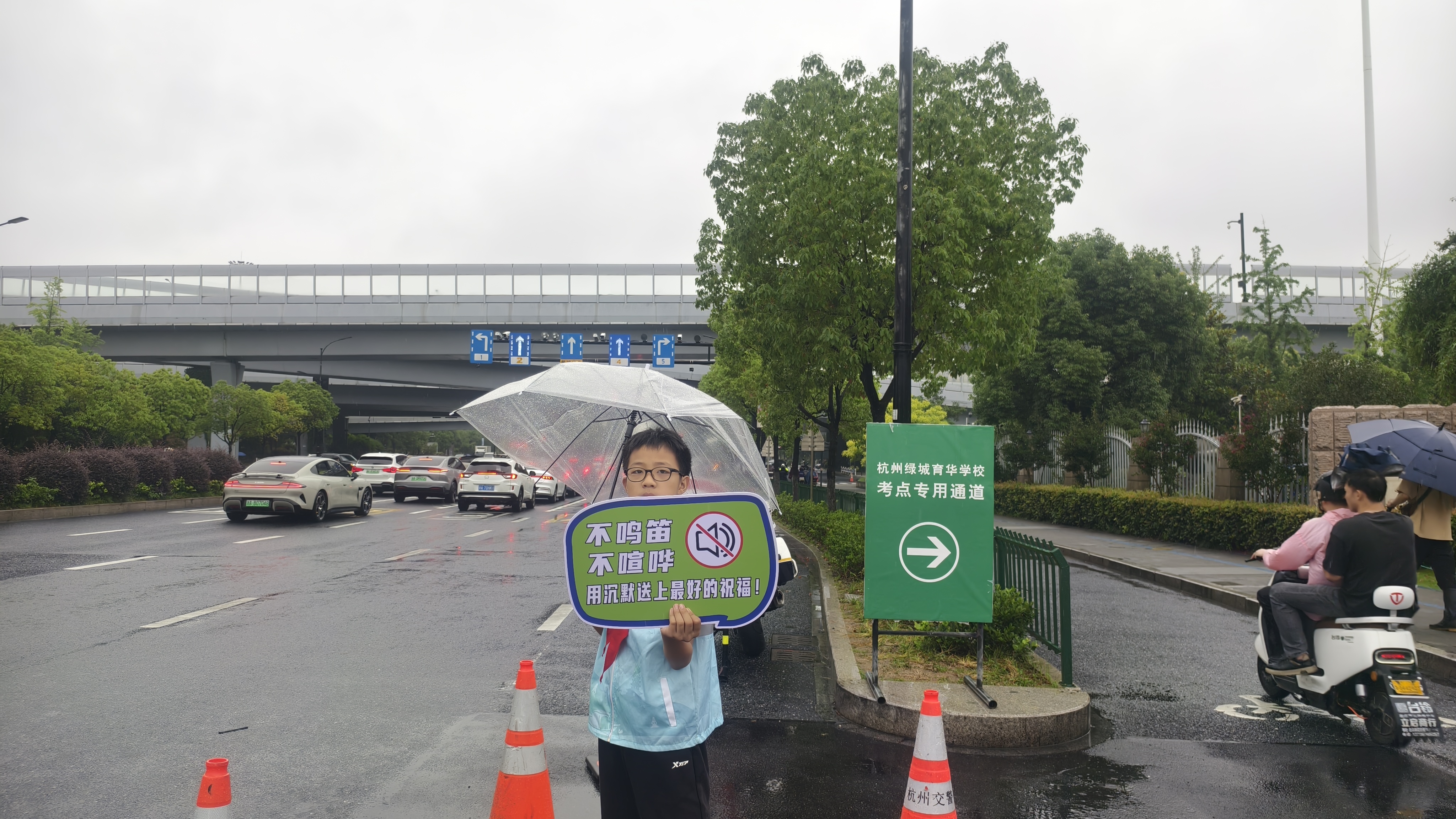 6月22日,天空中落下了密集的雨点,打在“绿城学校”这四个古铜色的大字上面,使这四个字蒙上了一层奇幻的光芒,在雨天中也显得熠熠生辉。 中考的哥哥姐姐们社会考结束之后,陆陆续续的走出来透气,等候已久的家长们也为考生们送上了点心,可见家长们的一片用心良苦。而我们则举着禁止鸣笛喧哗的牌子,守护着这一片宁静与和谐,为中考考生们营造出一个安静的考试环境。我手中举着的,不仅仅是一个写上了字的牌子,更是对中考考生们最美好的祝福,愿中考考生们都能在这次考试中旗开得胜,取得理想的好成绩。也祝我在接下来的一周中奋发图强,在一周之后的小升初考试中同样取得成功!加油✊