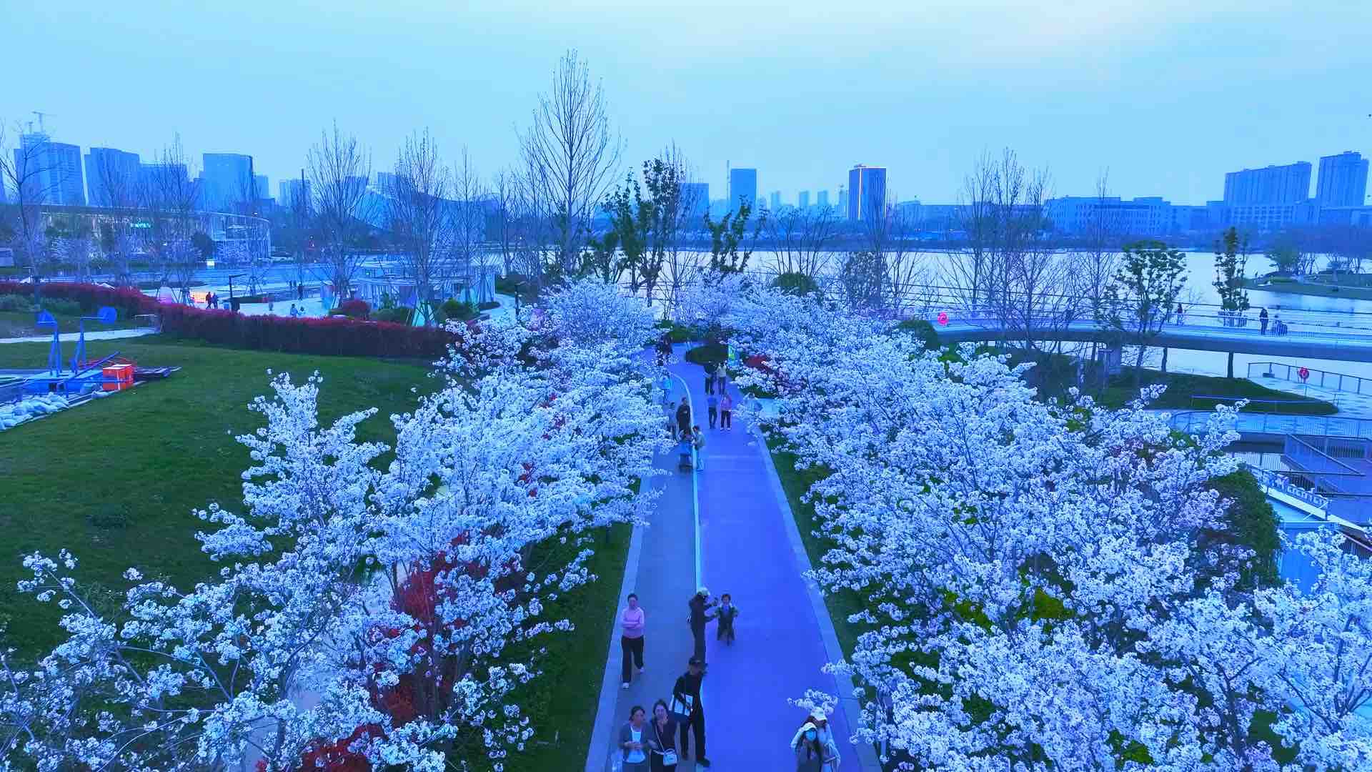 蓝调天幕下,樱花缀满枝头, 漫步在玉湖公园,连晚风都带着花香, 把整个春天的浪漫,都藏进这片夜色里。