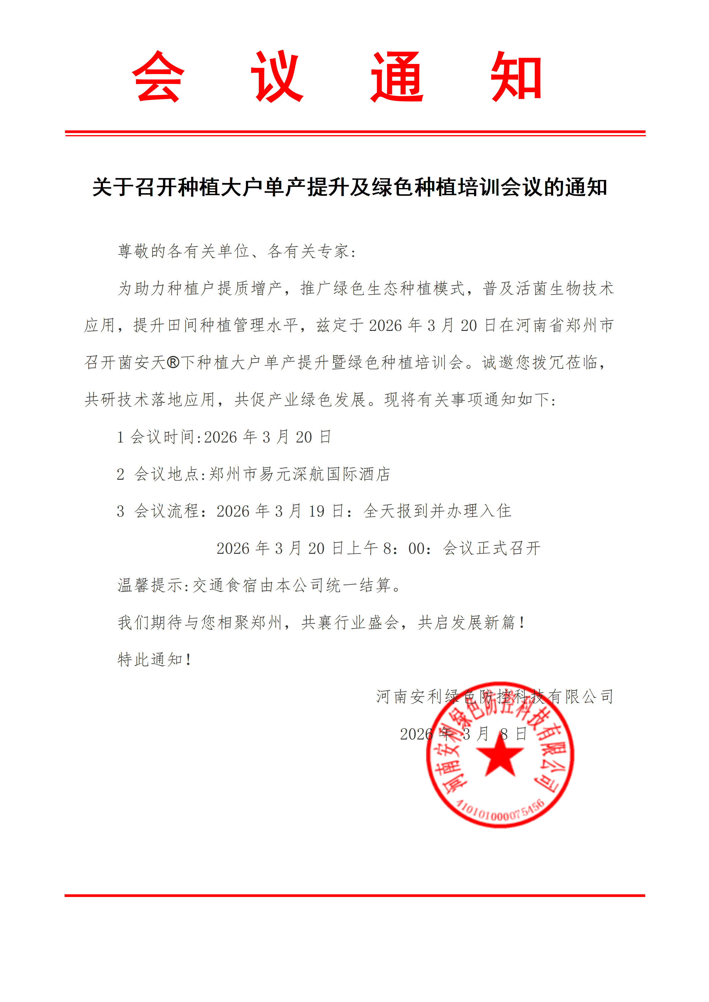关于召开种植大户单产提升及绿色种植培训会议的通知 各有关单位、各位专家: 为深入贯彻落实乡村振兴战略部署,助力种植户提质增产,推广绿色生态种植模式,普及活菌生物技术在田间的应用,全面提升种植管理水平,推动农业产业绿色高质量发展,经研究,决定召开菌安天下®种植大户单产提升暨绿色种植培训会。现将有关事项通知如下: 一、会议时间 - 报到时间:2026年3月19日(全天),同步办理入住手续 - 会议时间:2026年3月20日 上午8:00正式召开 二、会议地点 郑州市易元深航国际酒店 三、参会对象 各相关单位代表、农业领域专家、种植大户代表 四、会议内容 1. 活菌生物技术在绿色种植中的应用原理与实践案例分享 2. 种植大户单产提升关键技术与田间管理方案解读 3. 绿色生态种植模式推广与产业发展研讨 4. 技术落地对接与合作交流 五、相关说明 本次会议交通、食宿费用由河南安利绿色防控科技有限公司统一结算,无需参会人员另行支付。 六、其他事项 请各单位于2026年3月15日前将参会人员名单(姓名、单位、职务、联系方式)反馈至我司,以便统筹安排会务工作。 我们诚挚邀请您拨冗莅临,共研农业技术创新,共促产业绿色发展,携手谱写乡村振兴新篇章! 特此通知。 河南安利绿色防控科技有限公司 2026年3月8日