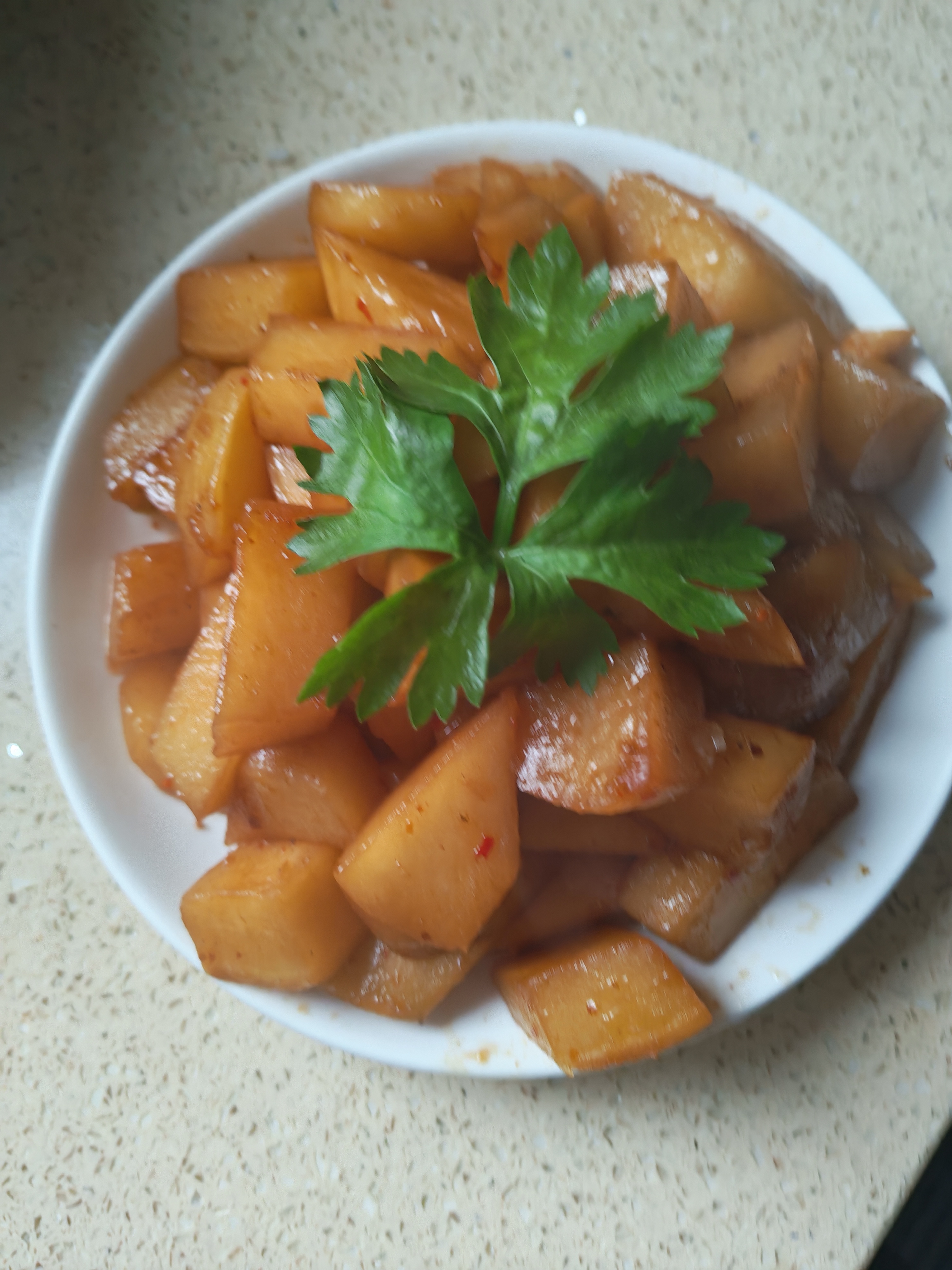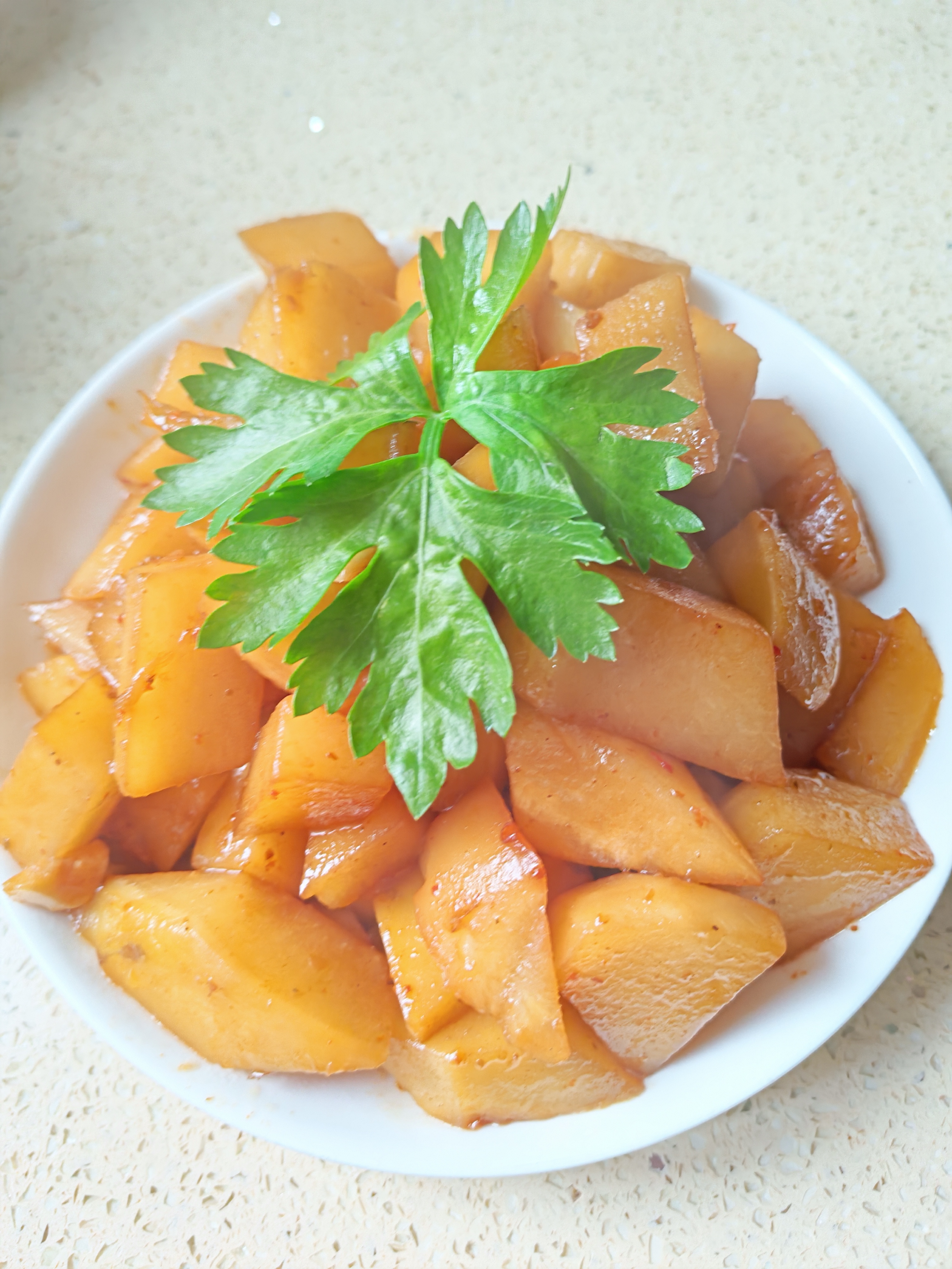红烧大头菜 极简家常味,一碗红烧大头菜,清淡回甘,配米饭能多干两碗~ 食材准备 大头菜、蒜末、生抽、辣椒面(不吃辣省略)、香醋、清水 详细步骤 1. 大头菜去皮洗净,切成大小均匀的块,方便入味易焖熟。 2. 热锅倒油,下入蒜末小火炒出浓郁蒜香,激出底味。 3. 放入大头菜块,开大火快速翻炒,炒到菜边微微微黄断生。 4. 淋入生抽提鲜上色,喜欢辣味撒少许辣椒面,翻炒均匀裹满酱汁。 5. 沿锅边淋少许香醋增香解腻,倒入适量开水,水量没过食材一大半即可。 6. 盖上锅盖小火焖煮,直至大头菜软糯入味,开大火收浓汤汁就能出锅。