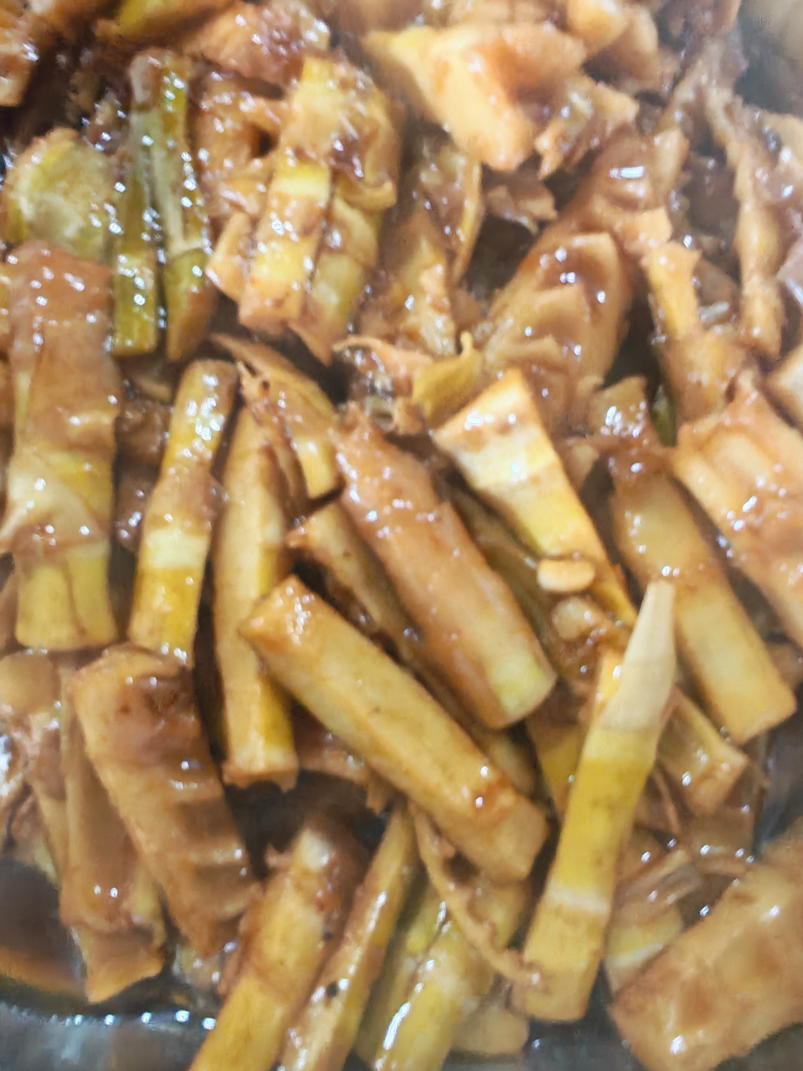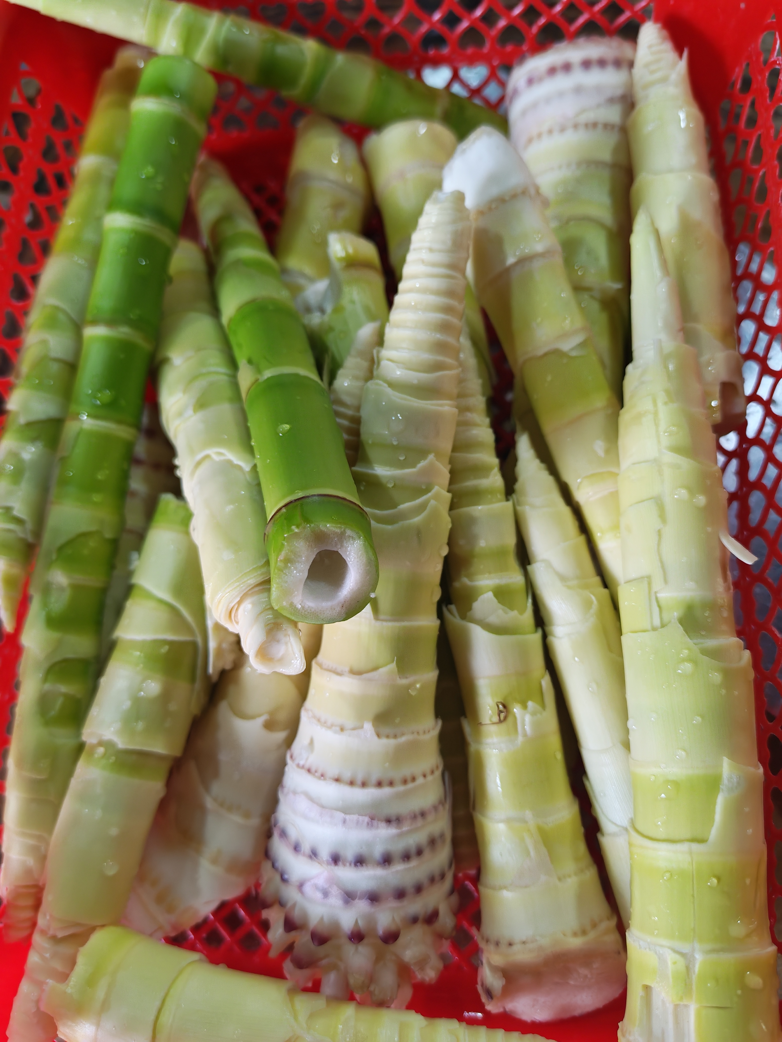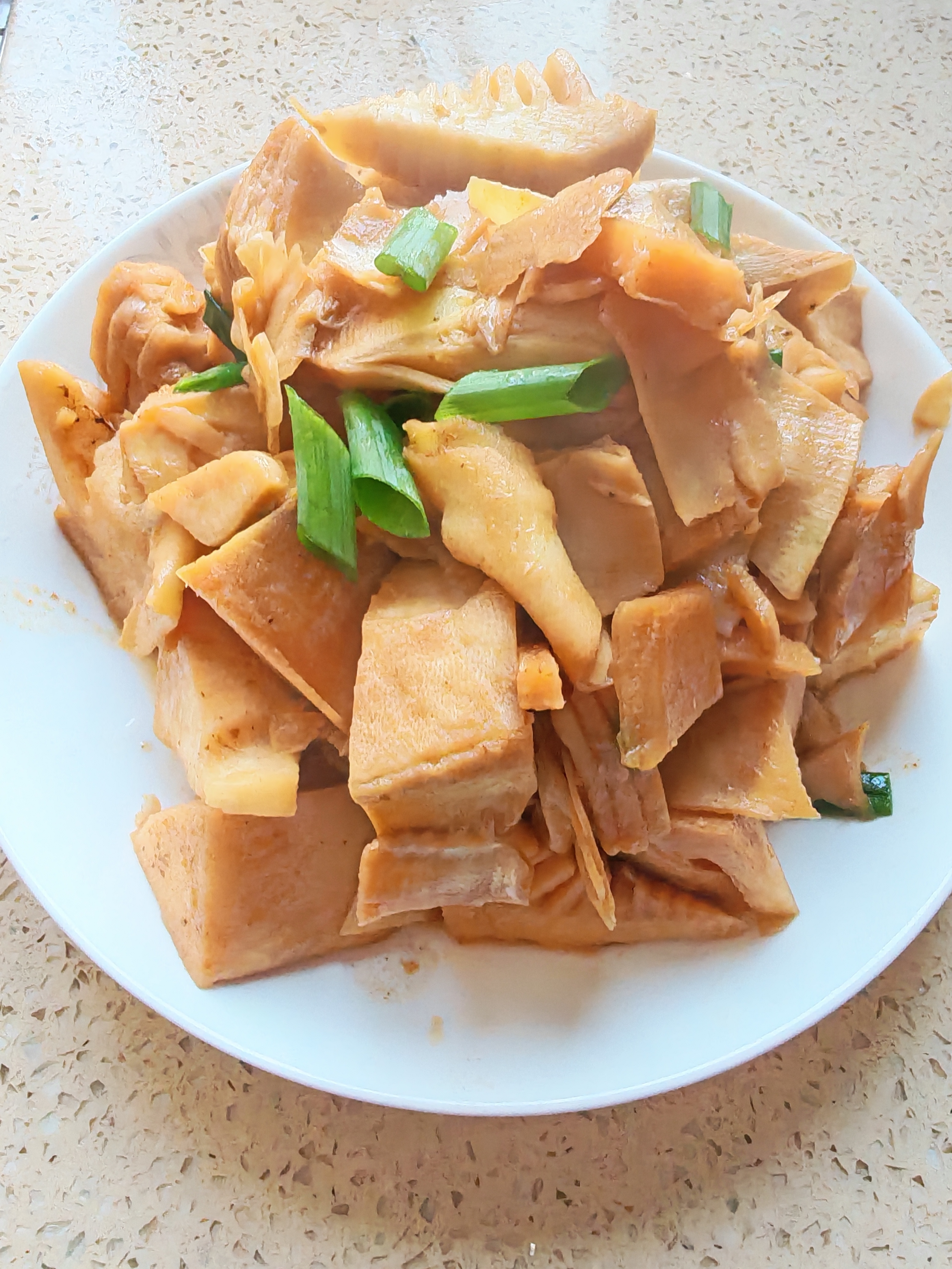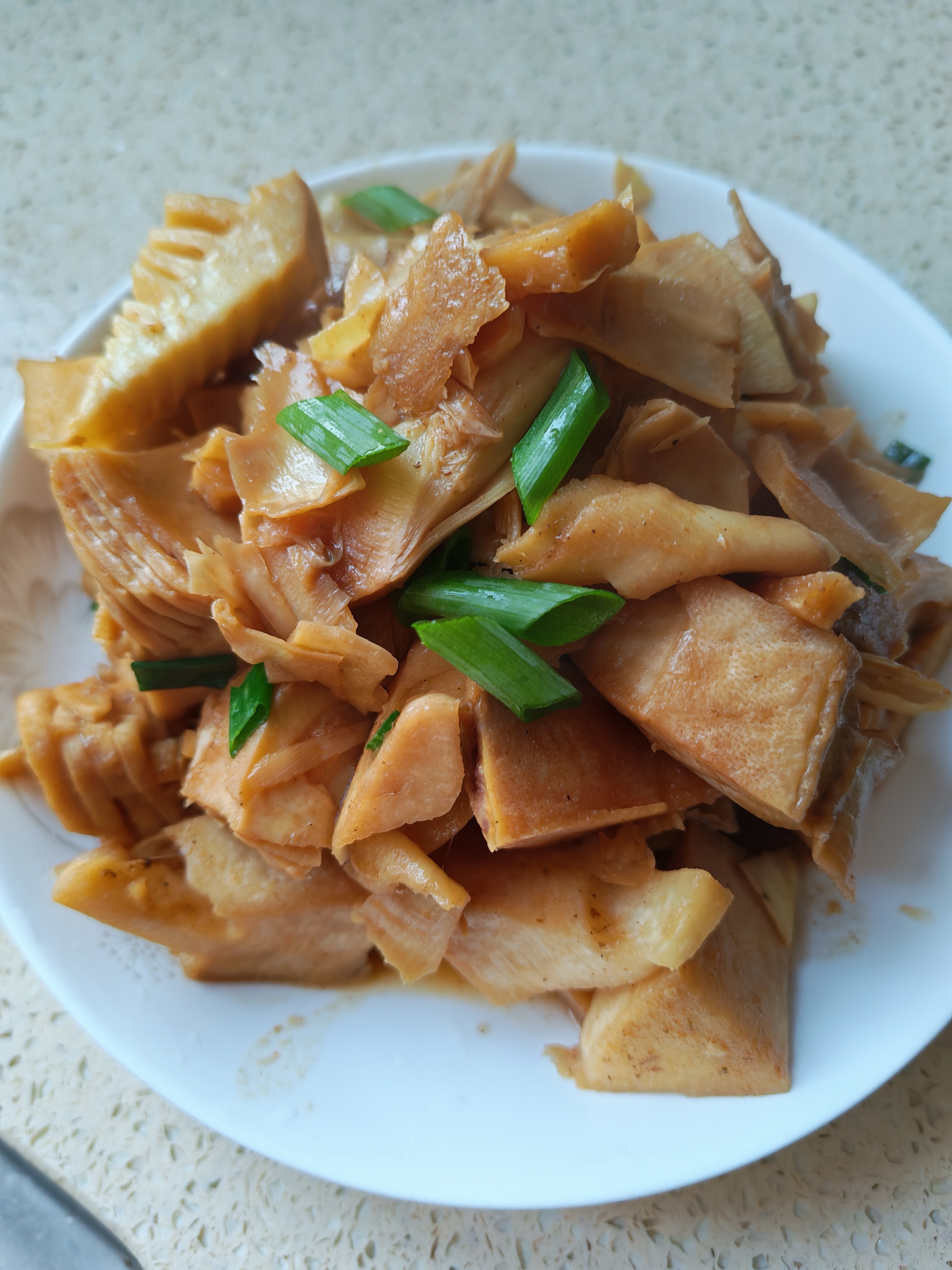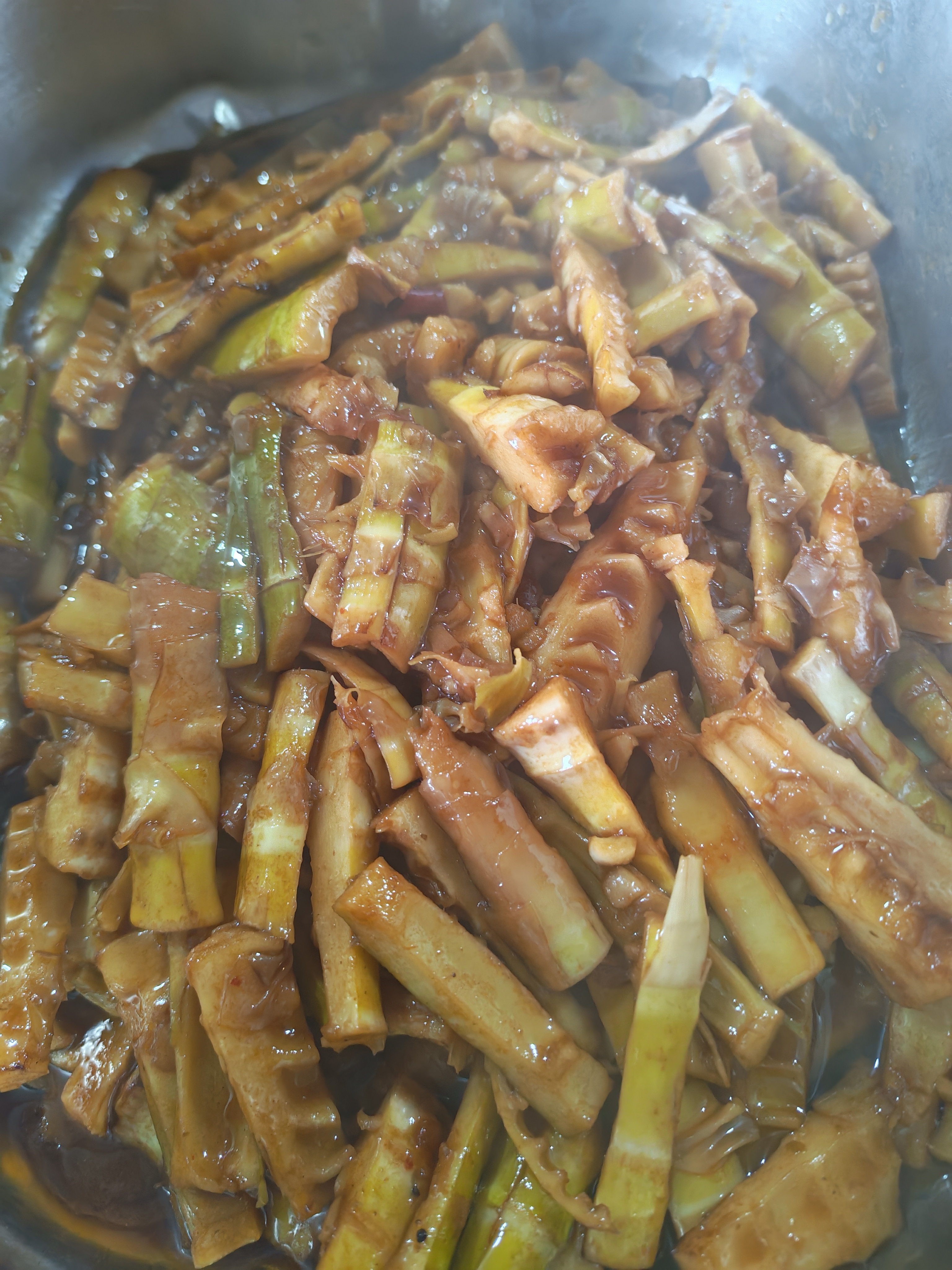 笋切好洗净,沥干进高压锅。 放油+白糖(微微炒化更香),加生抽、少许蚝油、开水刚没过笋底(水别多!)。 盖锅上汽后,小火压8~10分钟就行;关火自然泄压。 开盖开大火收汁,汤汁裹亮挂稠,最后再放味精提鲜,翻匀出锅。