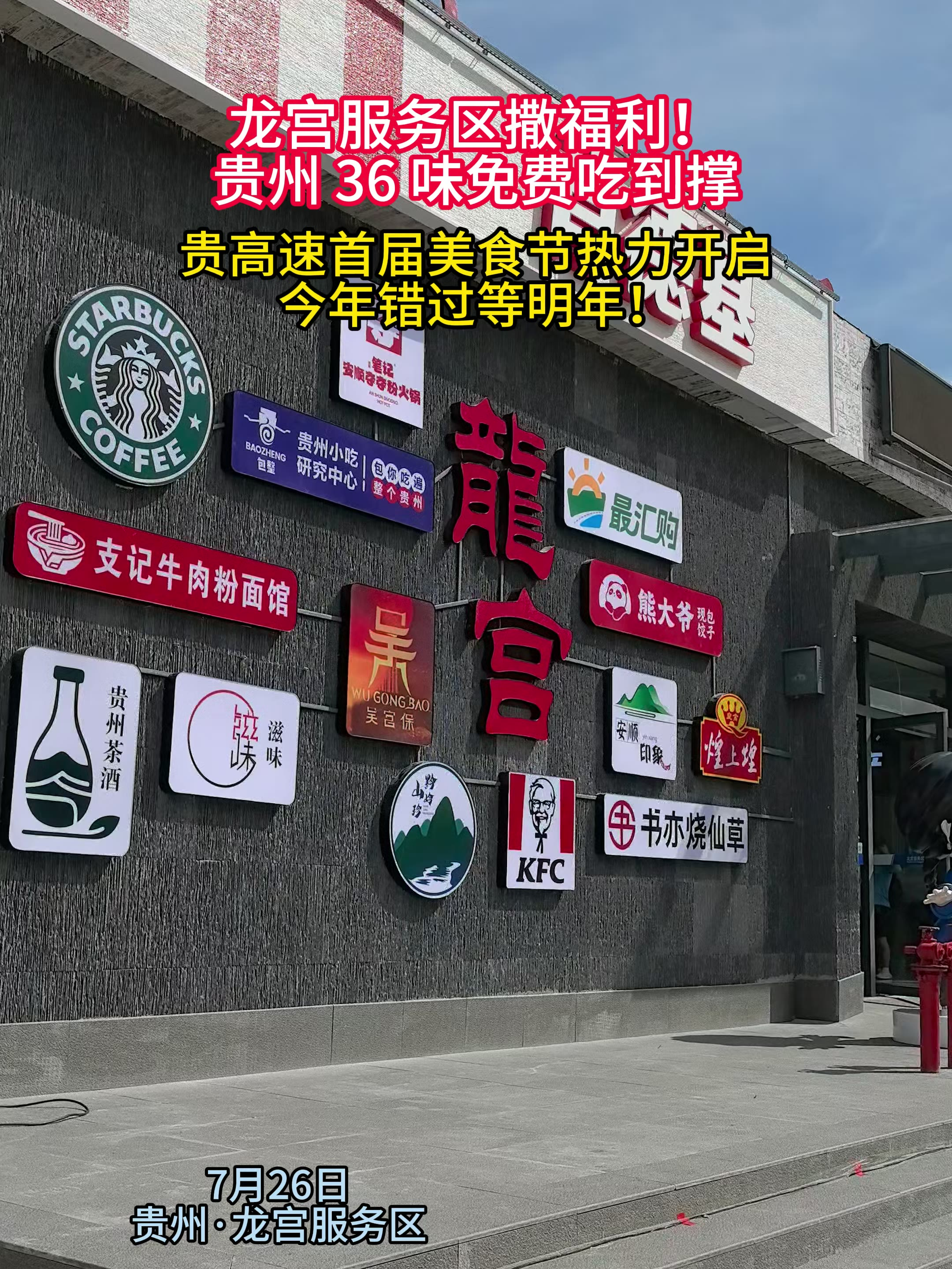 龙宫服务区撒福利!贵州 36 味免费吃到撑 贵高速首届美食节热力开启,今年错过等明年! “暑运途经龙宫服务区的朋友们,别错过!贵高速第一届美食节今日启幕!酸汤牛肉、盐酸扣肉……36 种贵州地道美食,全部免费吃!这免费的美味也太让人满足啦~没来的不用懊恼,明年咱们再相聚,把贵州美食一一品尝!”