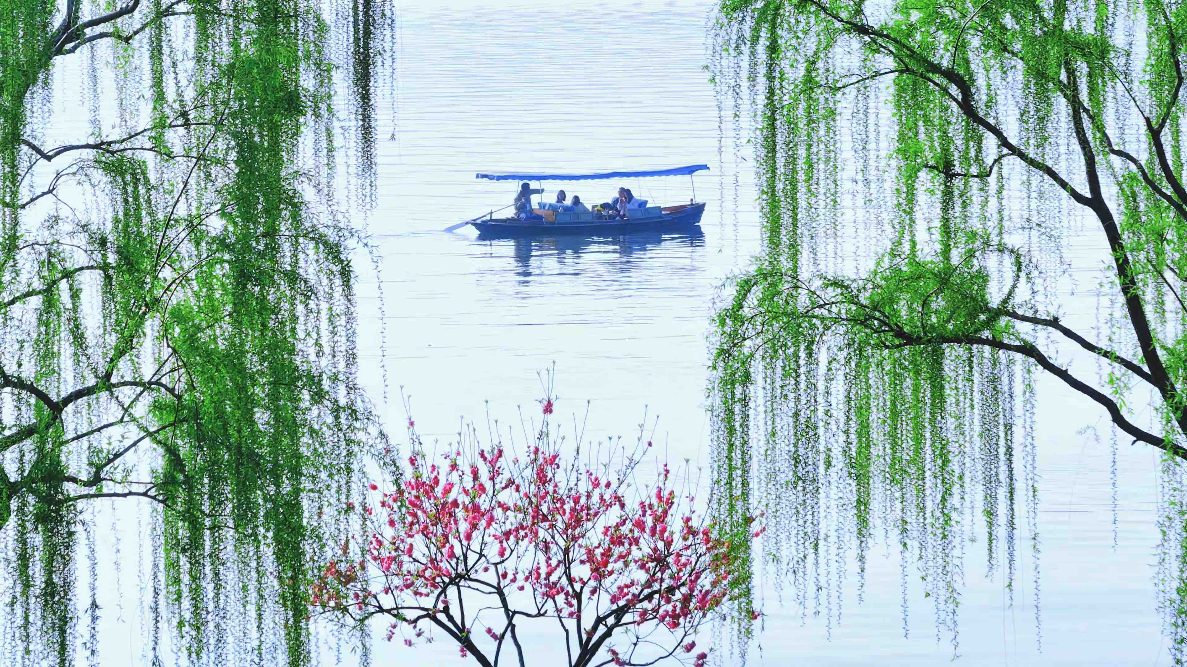 白居易诗词中写实景致:"最爱湖东行不足,绿杨阴里白沙堤" 桃红柳绿的白堤:间株杨柳间株桃,漫步白堤,桃花娇艳,柳丝轻拂,如入水墨画卷,朦胧而诗意