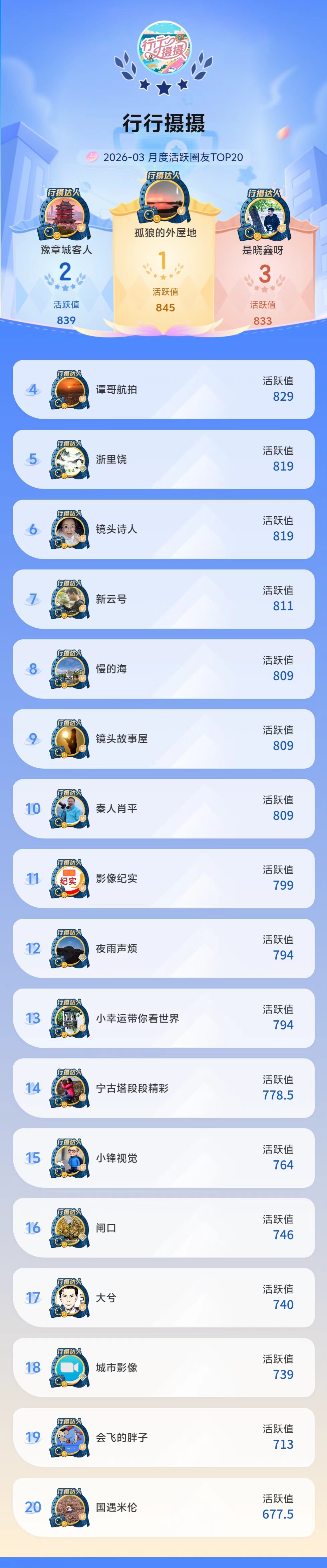 感恩相遇,不负热爱。刚刚过去的三月份,笔者再次入围潮新闻行行摄摄圈榜单,位列第八,成绩的取得既有自己的努力,也感谢金玉老师悉心指导,更离不开平台的认可和各位圈友的一路相伴。