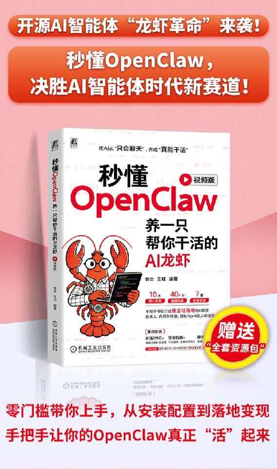 养一只帮你干活的AI龙虾🦐,让你的OpenClaw真正“活”起来!《秒懂OpenClaw》就是这样一本书,开源AI智能体“龙虾革命”来袭,你准备好了吗?一个面向智能体构建与运行的开源框架,能够将大模型、记忆、技能、工具调用与多平台接入整合起来,帮助用户搭建可配置、可扩展、可持续运行的数字助手。