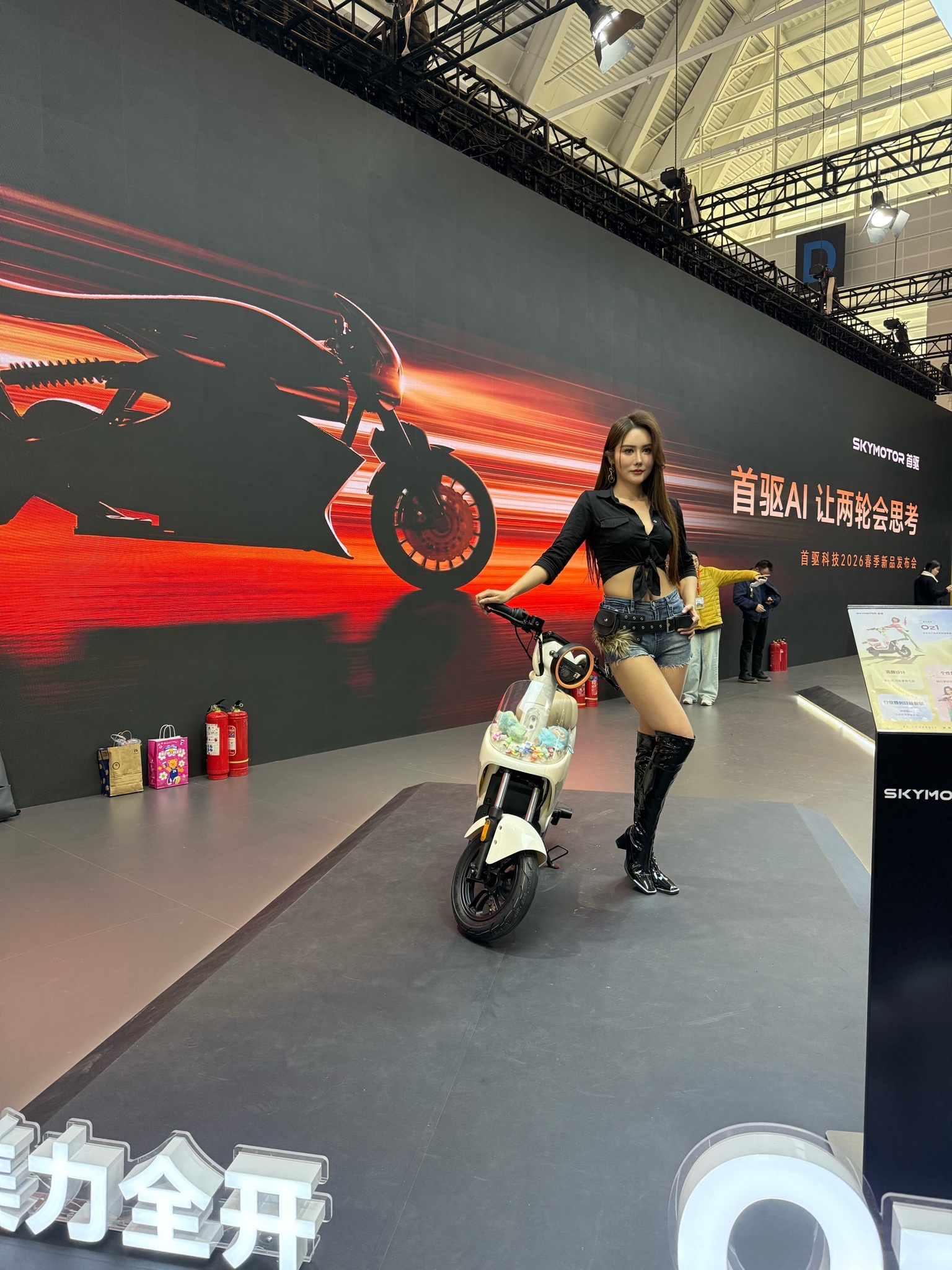 首驱O21亮相展会,白车配酷姐,红墙剪影超带感~AI电摩,帅就完事了!