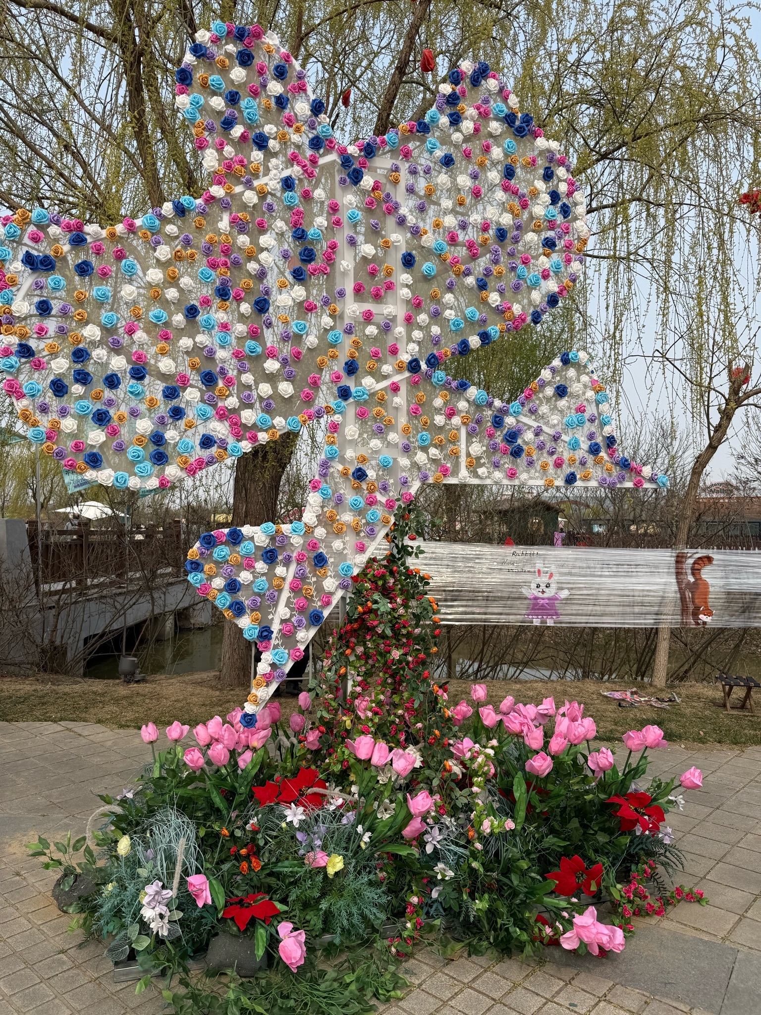 风筝🪁花墙太出片!粉色郁金香+彩玫瑰蝴蝶装置,柳树下随手一拍就是春日大片~