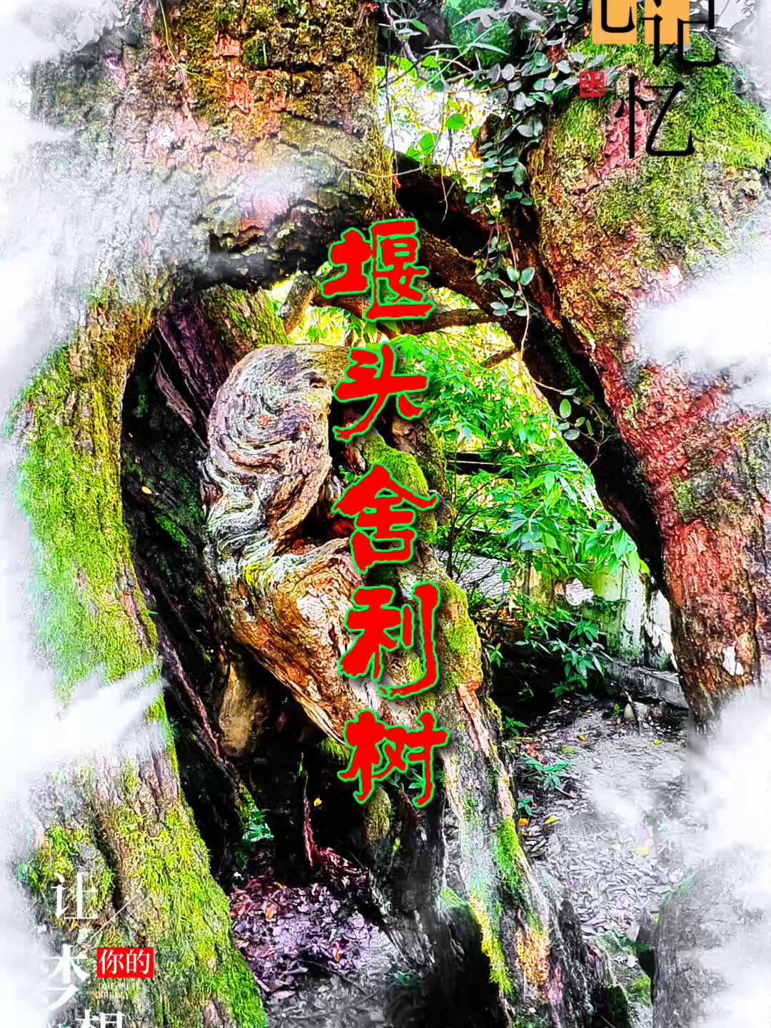 胸怀千年风雨,心藏百世忧伤!遍体鳞伤默无语,绽放心花万朵!经雷电交加的洗礼,留下的奇形怪状、千疮百孔依然是如此美丽——堰头村的舍利树在大自然千百年无数次的刀劈斧砍、电击雷劈下,呈现树干枝条上的伤口,自然裂开,后期在经过风摧雨淋下,伤口部位呈现白骨森森的状态。枯干与主杆连接树皮的地方,枯荣相聚,表现树木生命力的顽强,及生命的强大。
