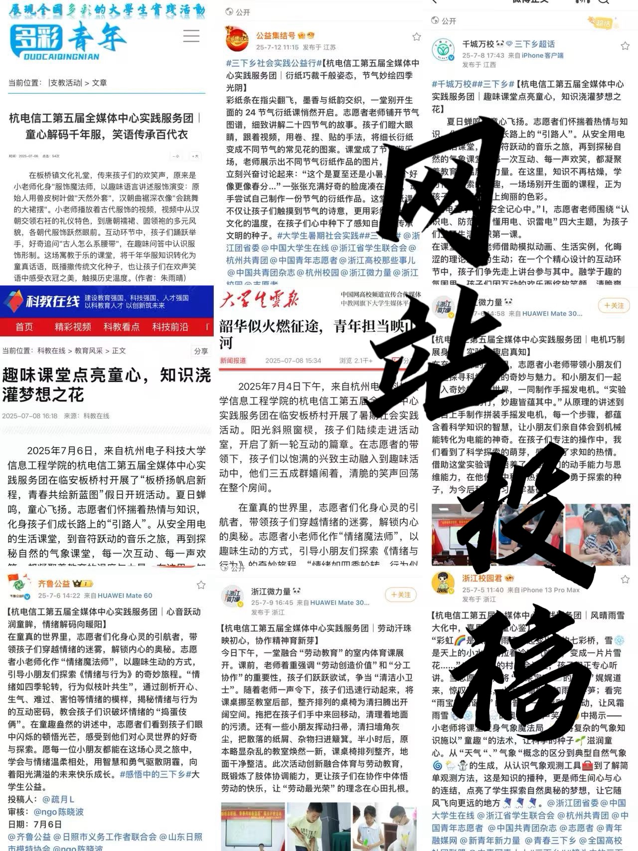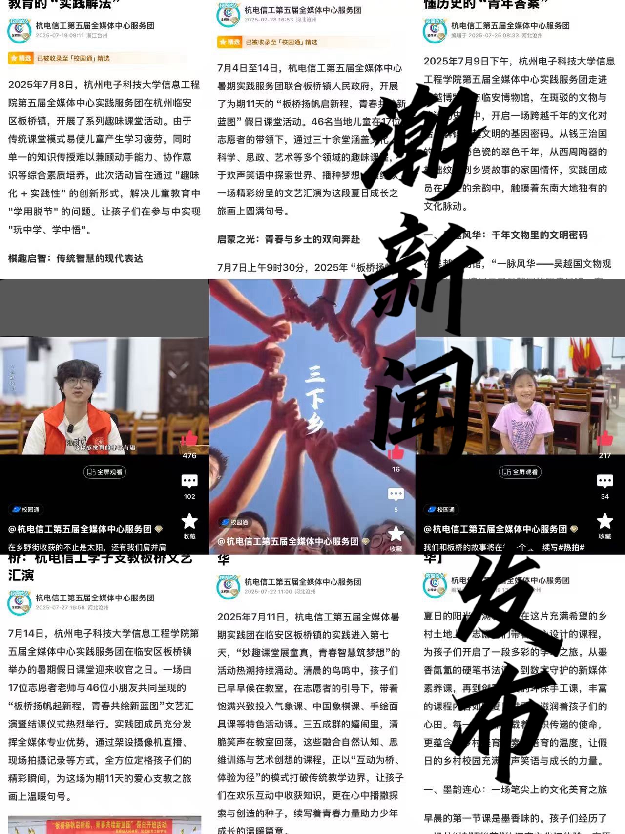 杭州电子科技大学信息工程学院第五届全媒体中心实践服务团正在参加潮新闻客户端举办的“2025大学生暑期实践”30强进10强pk赛,欢迎大家来给我们点赞! 📣团队名称:杭州电子科技大学信息工程学院第五届全媒体中心实践服务团 📣团队口号:板桥沃土滋新苗 全媒助力赋新能 📣团队简介: 📌7月4日-14日,杭电信工全媒体中心实践服务团赴杭州临安区板桥镇开展暑期实践,以“板桥扬帆启新程,青春共绘新蓝图”为主题,开展11天爱心支教、红色研学与文化调研活动。 📌支教开设音乐、手工、党史、天文等多元课程,并且同步直播保障“云参与”;组织新四军纪念馆红色之旅,传承铁军精神;走进临安博物馆、吴越文化博物馆,解码地域文明。活动结合建党104周年,将红色基因与传统文化融入实践,17名志愿者陪伴46名乡村儿童共同成长,以专业能力践行青春使命,助力乡村教育与文化传承。 📣团队成果: 📌本次实践成果丰硕,获多方认可。媒体传播方面,获临安板桥发布、学校官媒等官方报道4次,获浙江微力量、新青年新力量等156篇转发;微博阅读量累计2.8万,抖音播放量累计2.2万,自营小红书播放4308次,直播观看3051人次、点赞26.5万。 📌内容产出上,创作支教微电影,记录课堂与研学的精彩瞬间;书写实践风采与调研日记,沉淀活动细节。本次活动不仅丰富了乡村儿童的知识视野,播撒了爱国与文化种子,更锻炼了志愿者的实践能力,也为乡村教育添砖加瓦,彰显青年担当,扩大乡村教育与传统文化影响力。