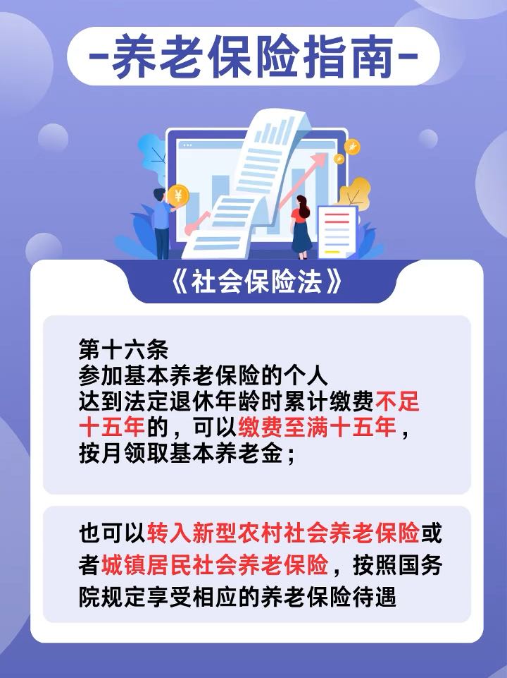 📣超龄人员缴养老保险指南:您的晚年保障这样做! 根据《社会保险法》第十六条规定:参加基本养老保险的个人,达到法定退休年龄时累计缴费不足十五年的,可以缴费至满十五年,按月领取基本养老金;也可以转入新型农村社会养老保险或者城镇居民社会养老保险,按照国务院规定享受相应的养老保险待遇。