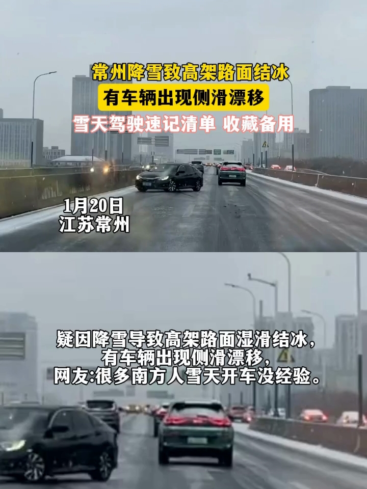 常州降雪致高架路面结冰,有车辆出现侧滑漂移,雪天驾驶速记清单收藏备用