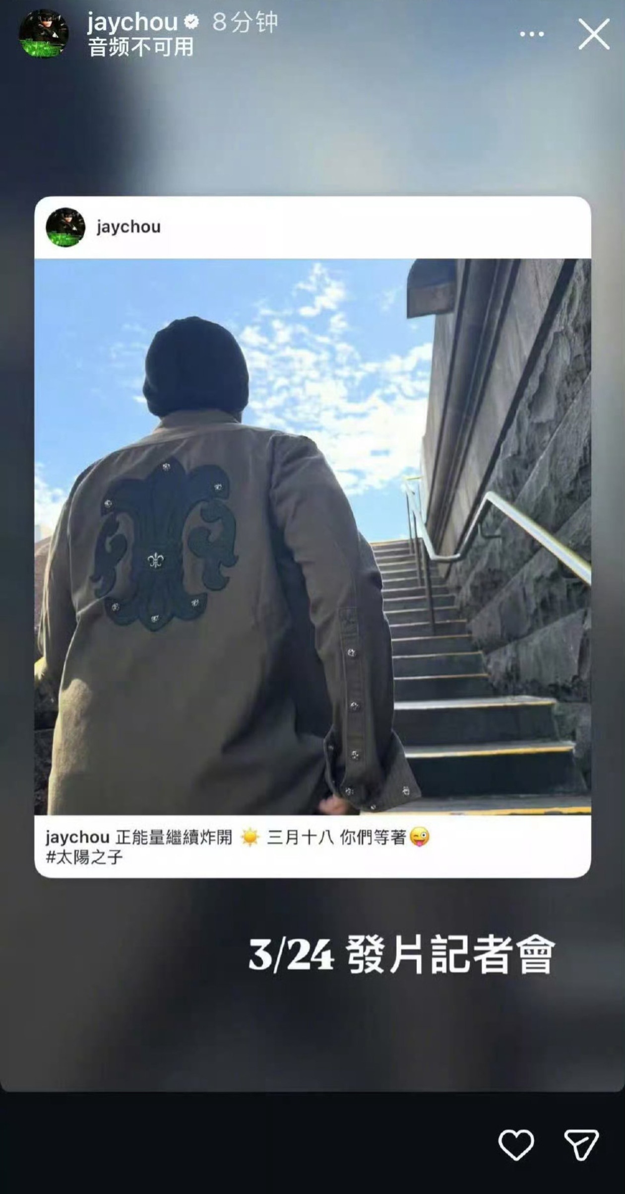 周杰伦将举行发片记者会!刚刚,周杰伦已正式官宣将于3月24日举行新专辑发片记者会,同时从3月18日起每日发布一则预告短片(Teaser),引爆粉丝狂欢。据悉,首支Teaser将于18日上线,内容形式未完全公开,但可能包含新歌片段或创作幕后。