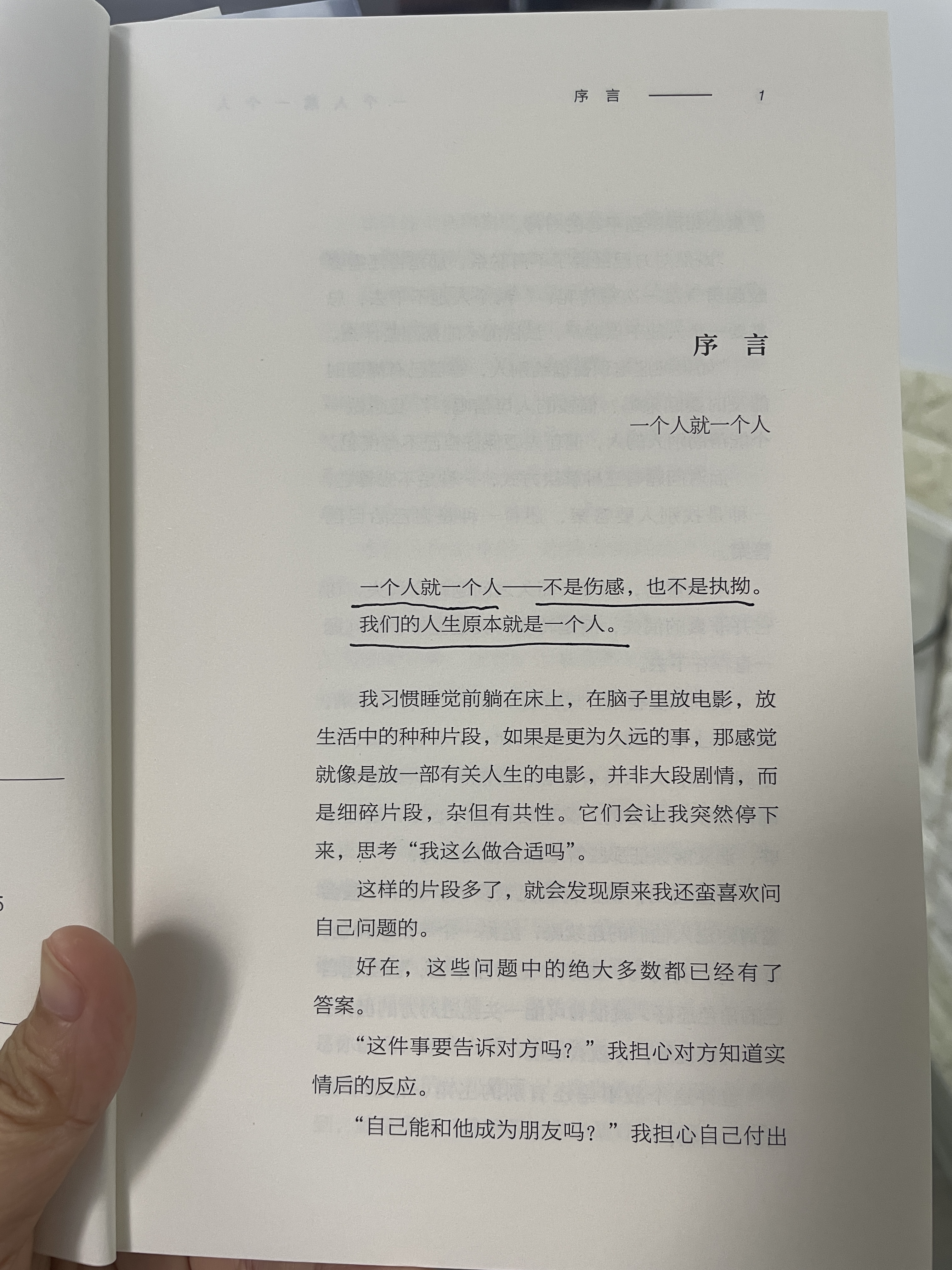 前几天好友推荐说,这本书不错,你看看! 这不昨晚书就收到了,今天一早拆了封读了个序言,不要太对味! 很喜欢这个写文风格,夹在书本里的信挠得人心痒痒,敦促着我尽快把书阅读完。 说起来,读书改变了我的生活,在书里遇到了许多人,看到许多事,好像陪着一个又一个书中的角色有过一段又一段的路。 一个人,可以静下心来阅读,沉浸其中,不觉间我也有了这样的独处能力。 一个人就一个人,期待里面的故事~