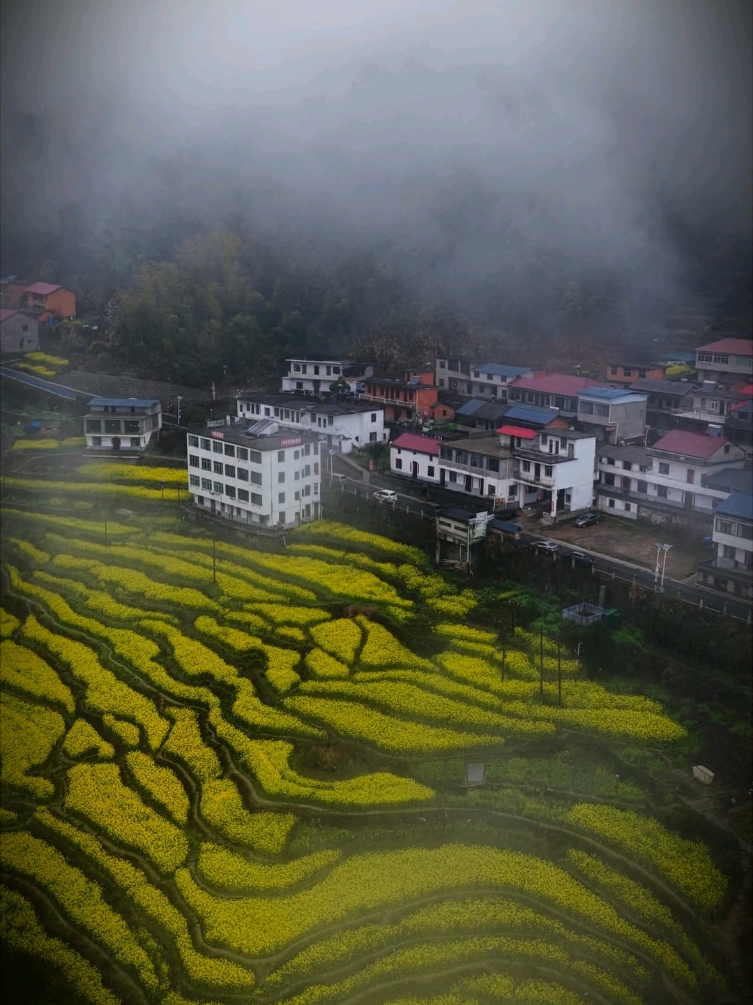 烟雨锁牛岭,云雾漫梯田。春分刚过,菜花鎏金的牛岭就被染成了一幅流动的水墨。