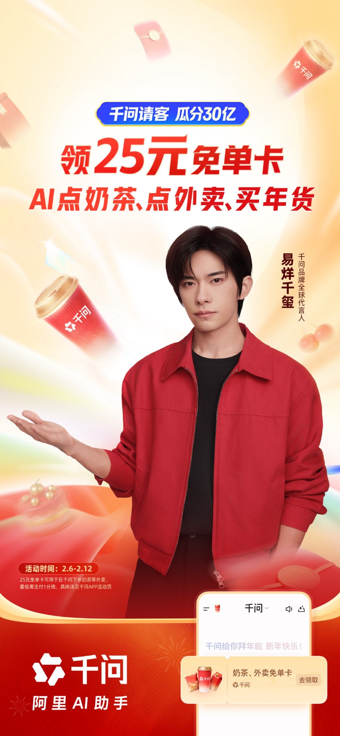 易烊千玺邀你上千问AI购物 感谢易烊千玺的安利让我年前过上好日子了~已经邀请好多人上千问领25元免单卡了,现在办公室的下午茶全是千问安排的!而且自从用了千问后,不说能省钱,连工作效率都变高了,调研资料,梳理框架什么都能做,真的,感谢千玺和千问提前让我们过大年了~ 千问免单