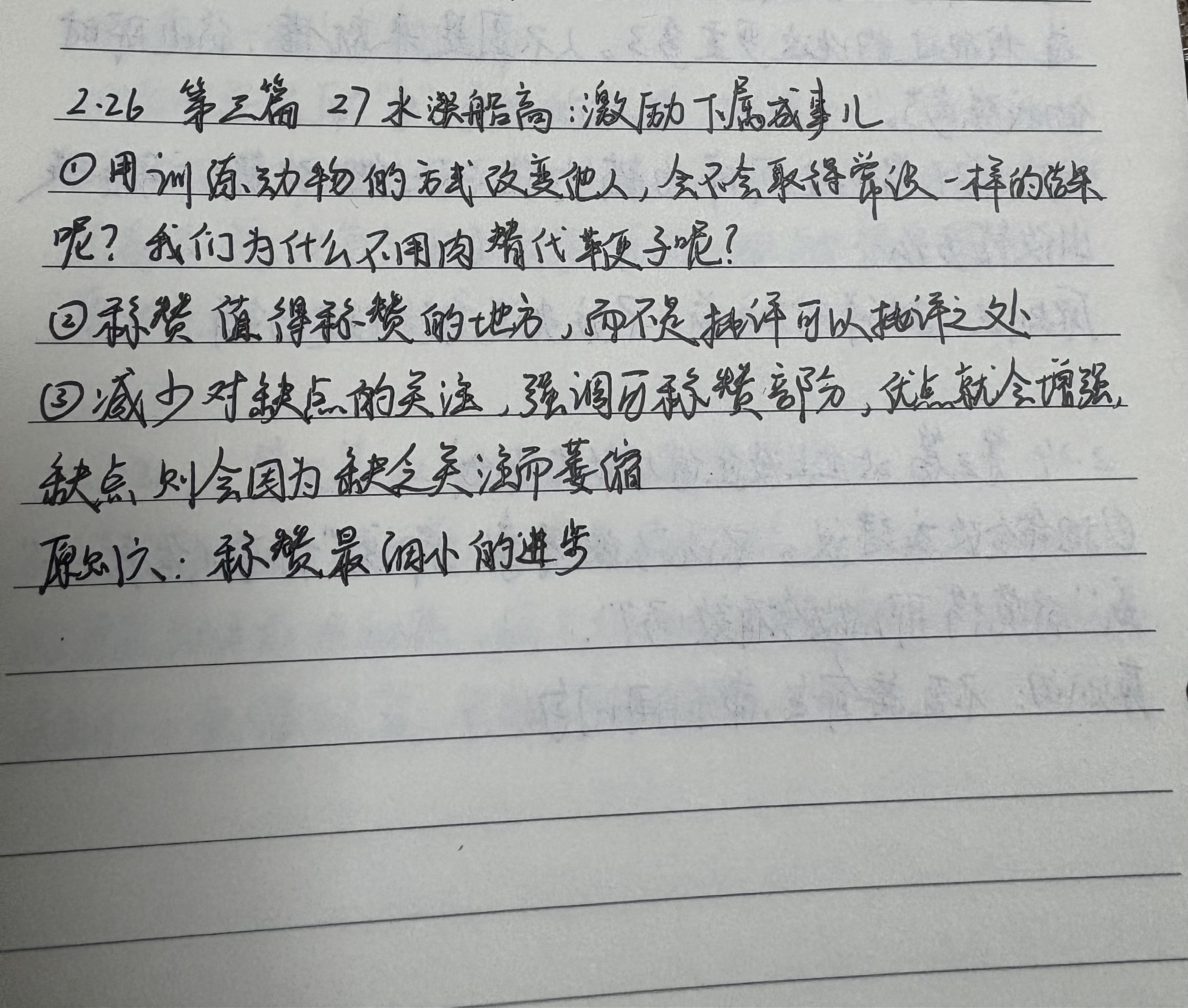 #人性的弱点# Day23 第三篇 27水涨船高:激励下属成事儿 用训练动物的方式改变他人,会不会取得常识一样的结果呢?我们为什么不用肉替代鞭子呢? 称赞值得称赞的地方,而不是批评可以批评之处。 减少对缺点的关注,强调可称赞部分优点就会增强,缺点则会因为缺乏关注而萎缩 原则六:称赞最细小的进步