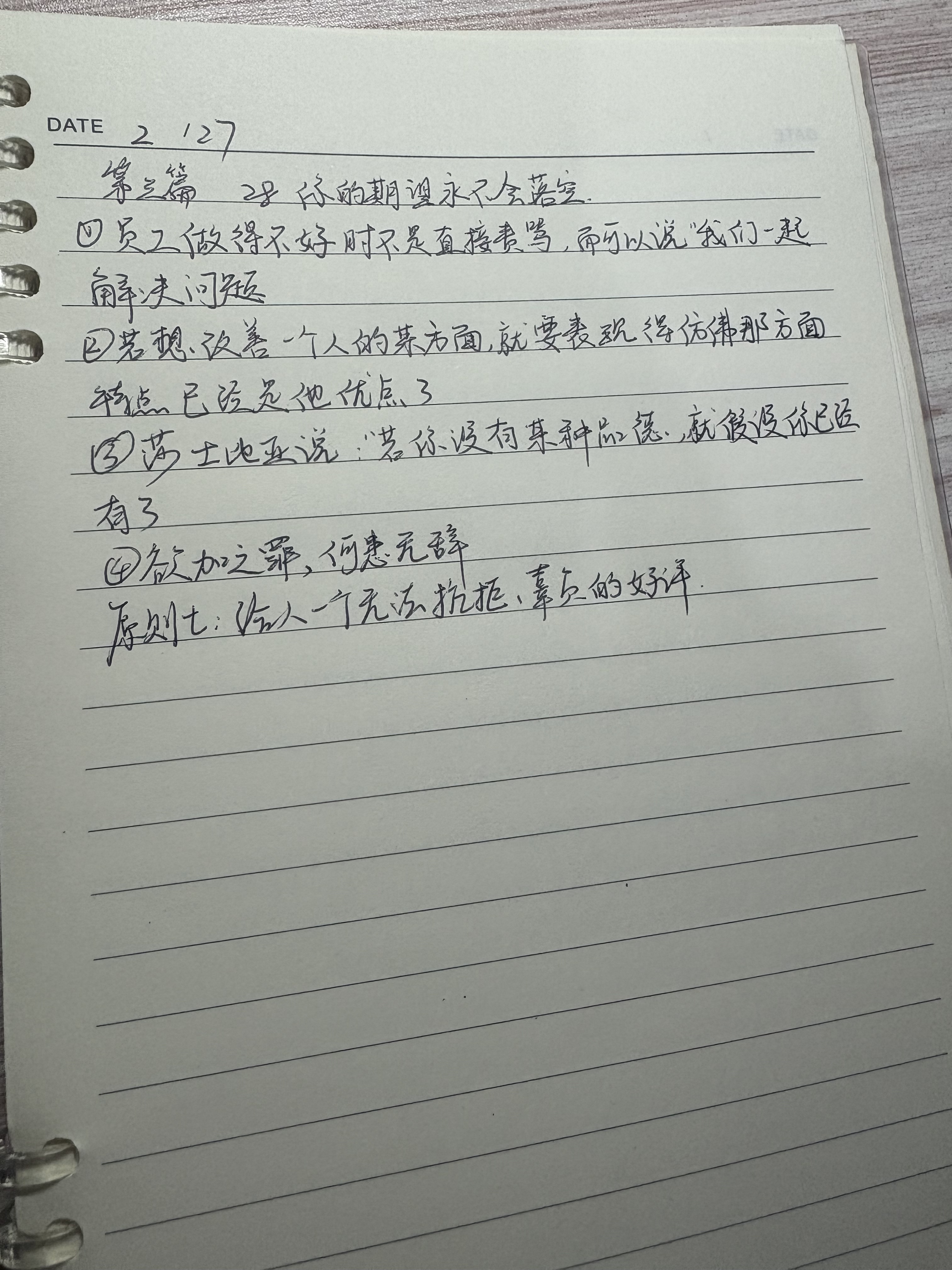 #人性的弱点# Day24 第三篇28你的期望永不会落空 员工做得不好时不是直接责骂,而可以说"我们一起解决问题” 若想改善一个人的某方面,就要表现得仿佛那方面特点已经是他优点了 莎士比亚说:"若你没有某种品德,就假没你已经有了” 欲加之罪,何患无辞 原则七:给人一个无法抗拒和辜负的好评
