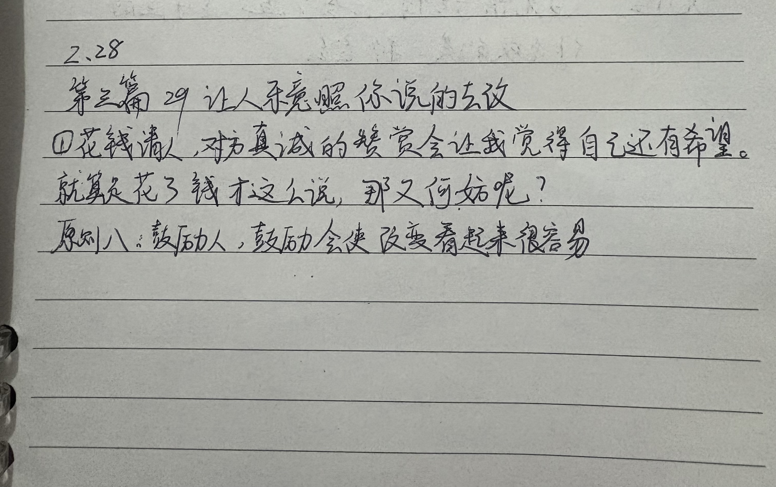 #人性的弱点# Day25 第三篇29让人乐意照你说的去改 某女士本不擅长跳舞,雇请的第一位舞蹈老师说她完全没天赋,还是放弃吧,于是女士把她辞退了。请的第二位老师说她节奏感不错,很青春动人,生命力很可贵。这位老师抓着优点夸,鼓励她成为舞蹈爱好者。女士说花钱请人,对方真诚的赞赏会让我觉得自己还有希望。就算是花了钱才这么说,那又何妨呢? 是的,所以ai时代的到来人的情感表达愈发重要!ai可能会慢慢替代白领、接着是蓝领...唯独代替不了人类的情感啊 原则八:鼓励人,鼓励会使改变看起来很容易