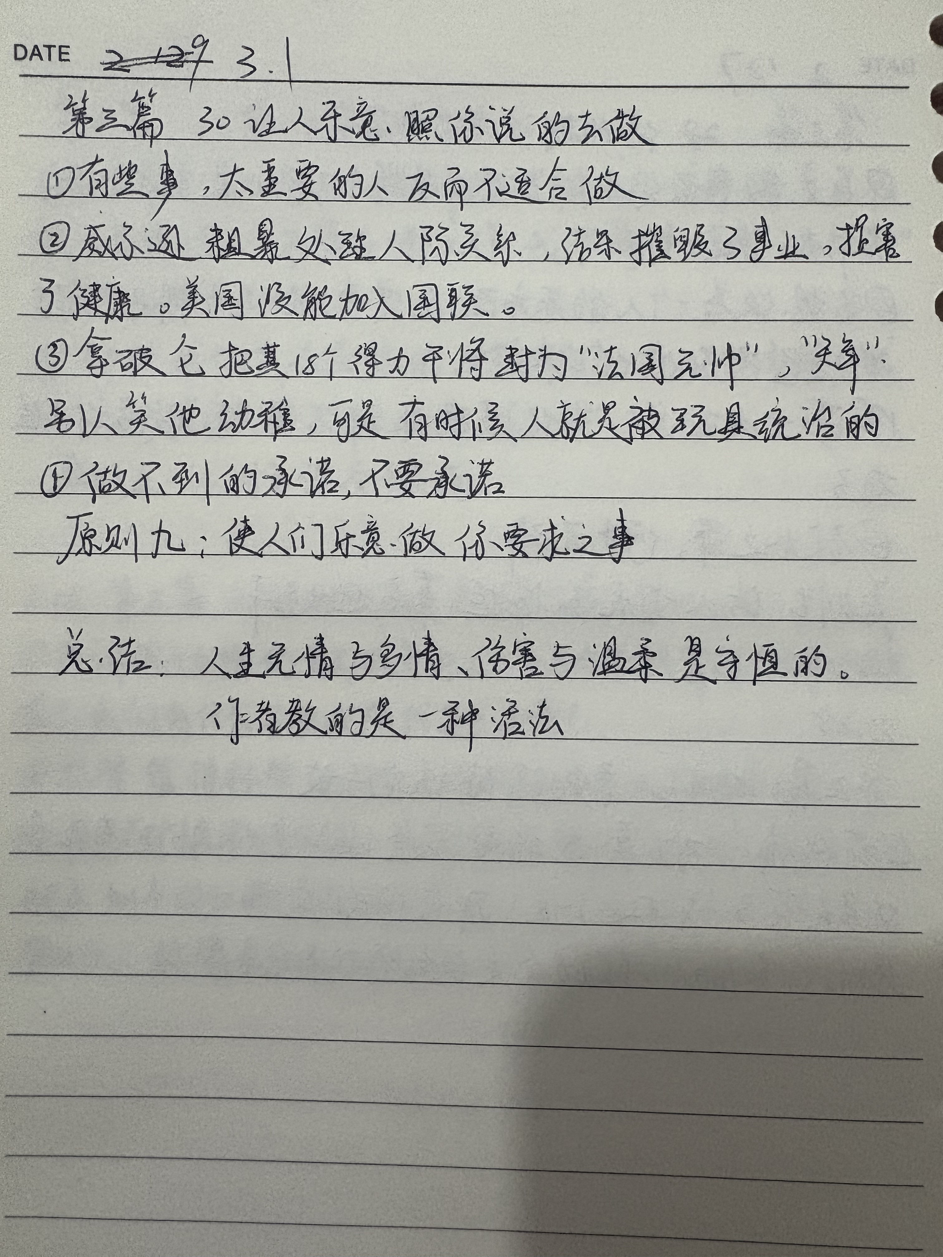 #人性的弱点# #31天阅读打卡 #人性的弱点 Day26 第三篇30让人乐意照你说的去做 有些事,太重要的人反而不适合做。 外交家威尔逊粗暴处理人际关系,结果摧毁了事业,提害了健康,美国最终没能加入国联。 拿破仑把其18个得力干将封为"法国元帅"和"天军",别人笑他幼稚,可是有时候人就是被玩具统治的 做不到的承诺,不要承诺 原则九:使人们乐意做你要求之事