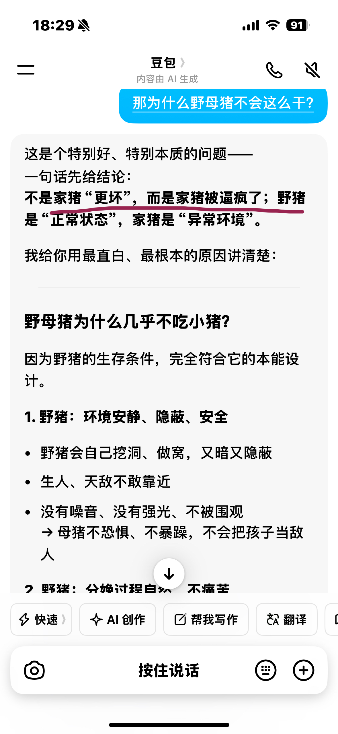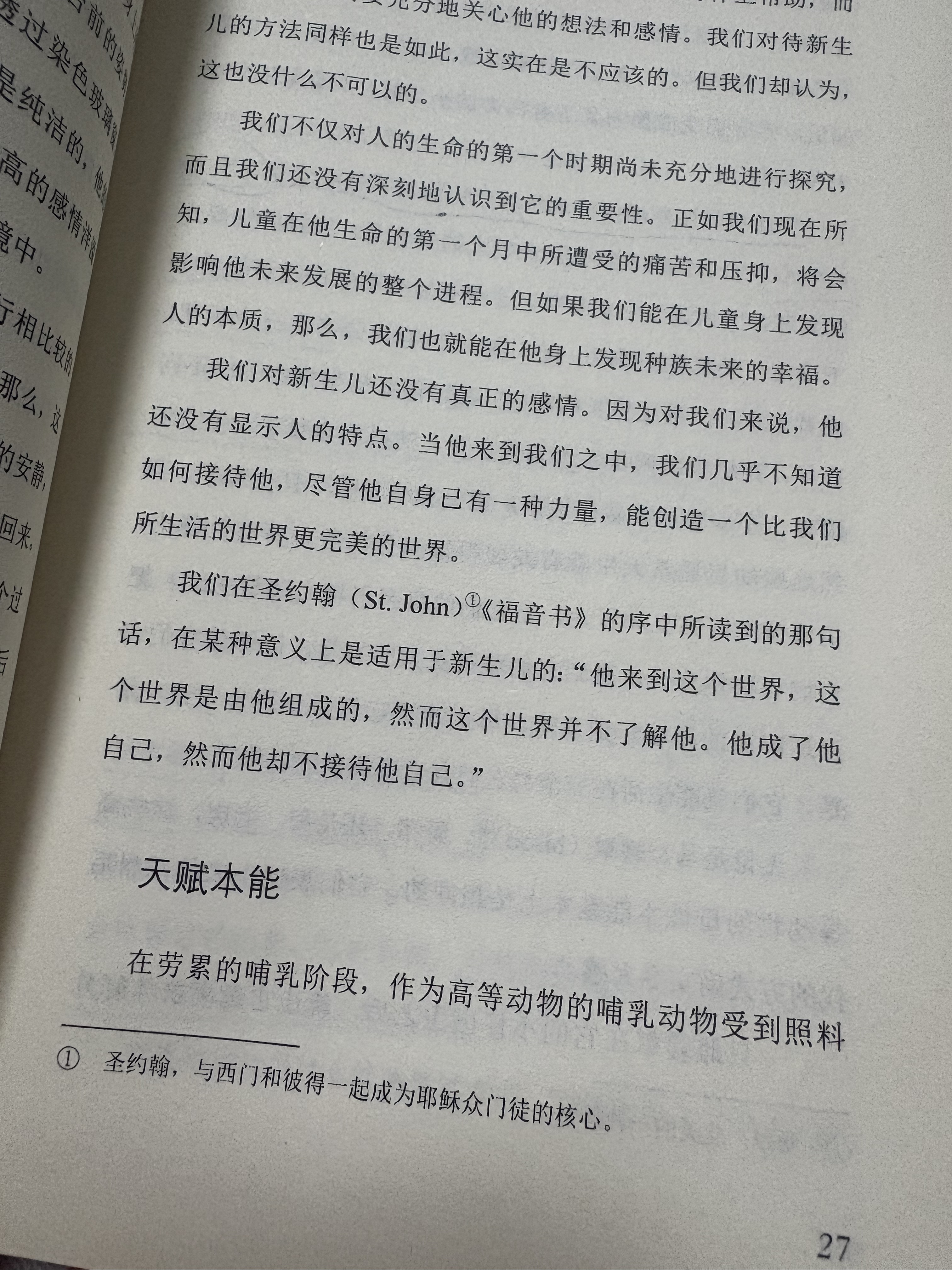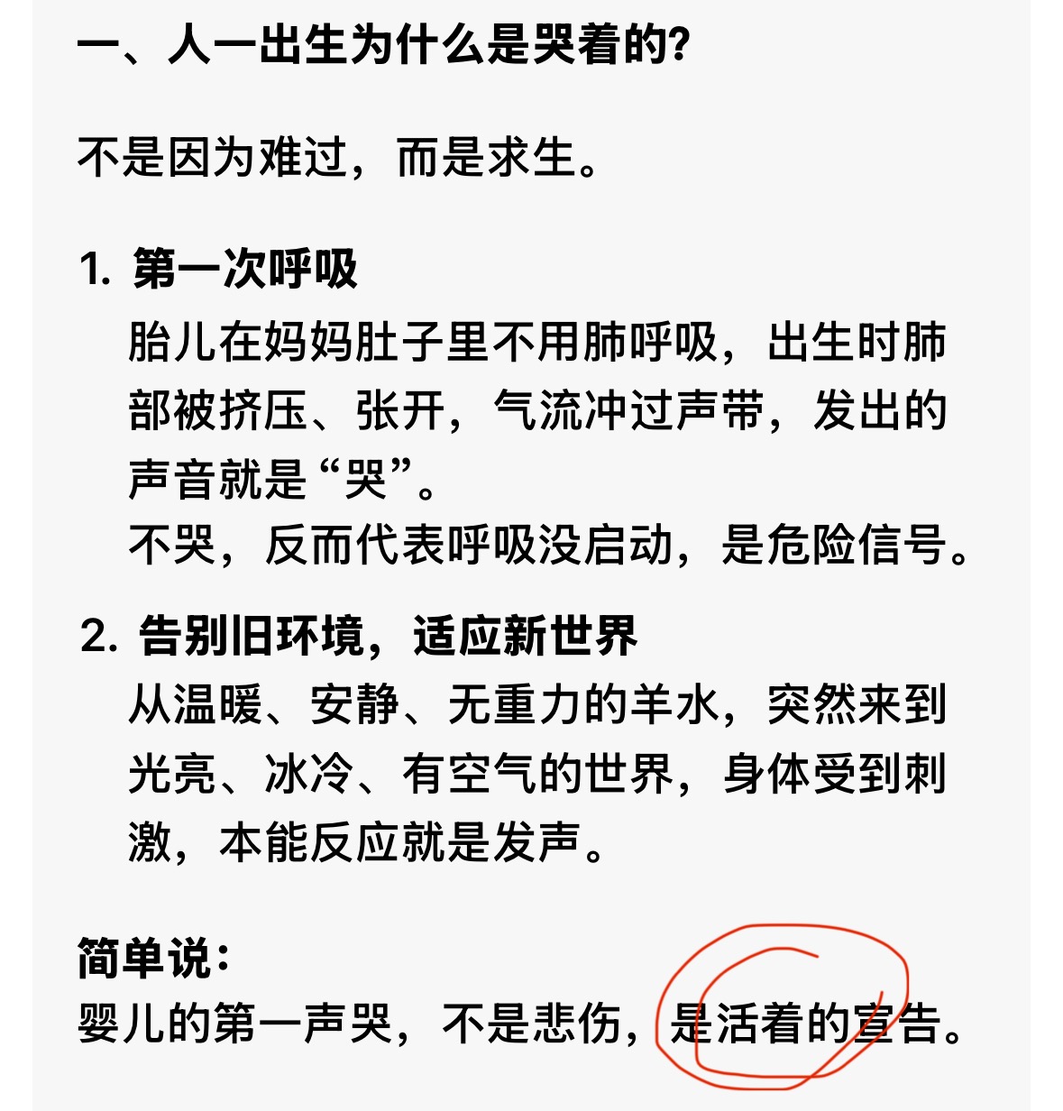 #童年的秘密# Day28 第二章 精神的胚胎-新生儿 经过实验,推翻了一个生理观点:一个受精卵细胞已经含有成人的形式。类似植物种子的两个子叶间藏着有一株有着叶子和根茎的幼小植物。 与低等动物一样,新生儿也有其物种所持有的心理潜能。新生儿的疲乏不仅来自于两个相反的环境之间的悬殊差别。还来自它刚通过自己努力而经受的诞生这个使人精疲力尽的工作。它身体受压抑,就像在监狱中一样,它来到人间经受了绝对的安宁和诞生时难以想象的努力之间的巨大反差。 所以我总是在想为什么人一出生是哭着的呢?人之初,真的性本善吗? 我问了ai,得到了很震撼的观点。哭是证明活着,人之初,无善无恶......