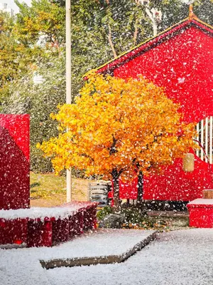 杭州下雪了红墙银杏藏不住的冬日浪漫,当杭州的秋色遇见北方的雪… 滨江这个宝藏地今年冬天直接封神!红墙+银杏+飘雪的组合 小亭子、红灯笼、落雪的长椅直接把北京秋日的氛围感搬来了江南。这片艳红撞进眼里,搭配满树金灿灿的银杏叶,细碎的白絮裹着黄叶子落下来,瞬间把浪漫值拉满是那种“江南秋意里掺了点北方冬韵”的奇妙质感