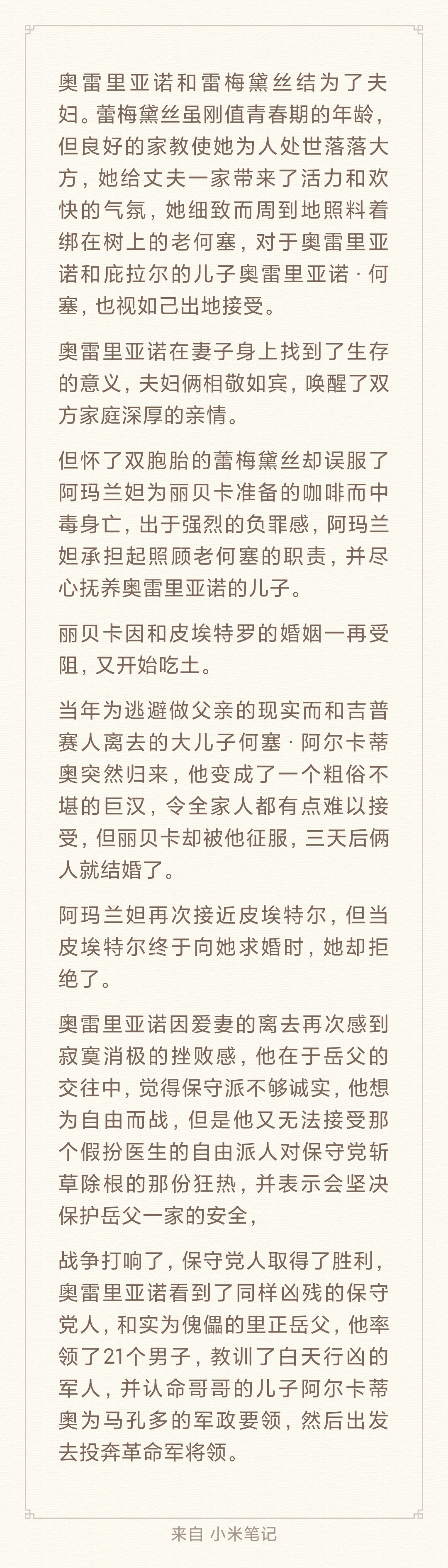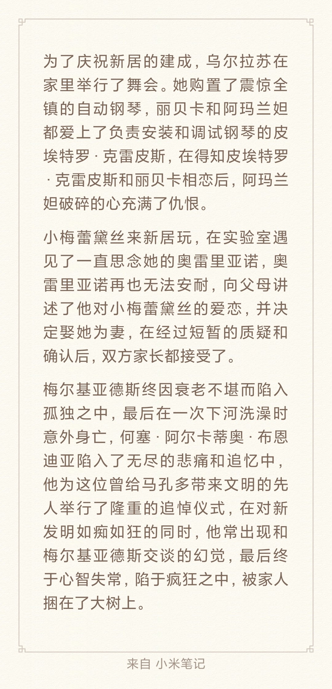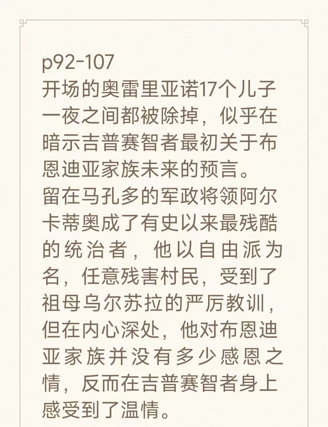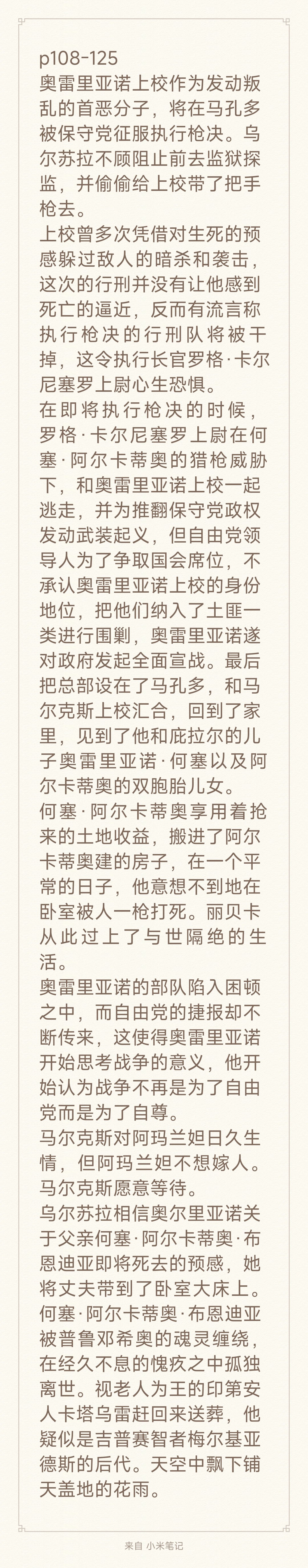 继续《百年孤独》第71页—91页,内容梗概见图。 对于奥雷里亚诺校长来说,两个女人他都没保护好。第一个是因为他不够及时,而第二个,他的妻子,在家里都会被毒死,在受挫自责的同时,他对家人的感情也拉开了距离。 当自由党保守党派战争打响,出于一种内心的正义和对自我的释放,他投入到了战斗中,寻找自己的存在。