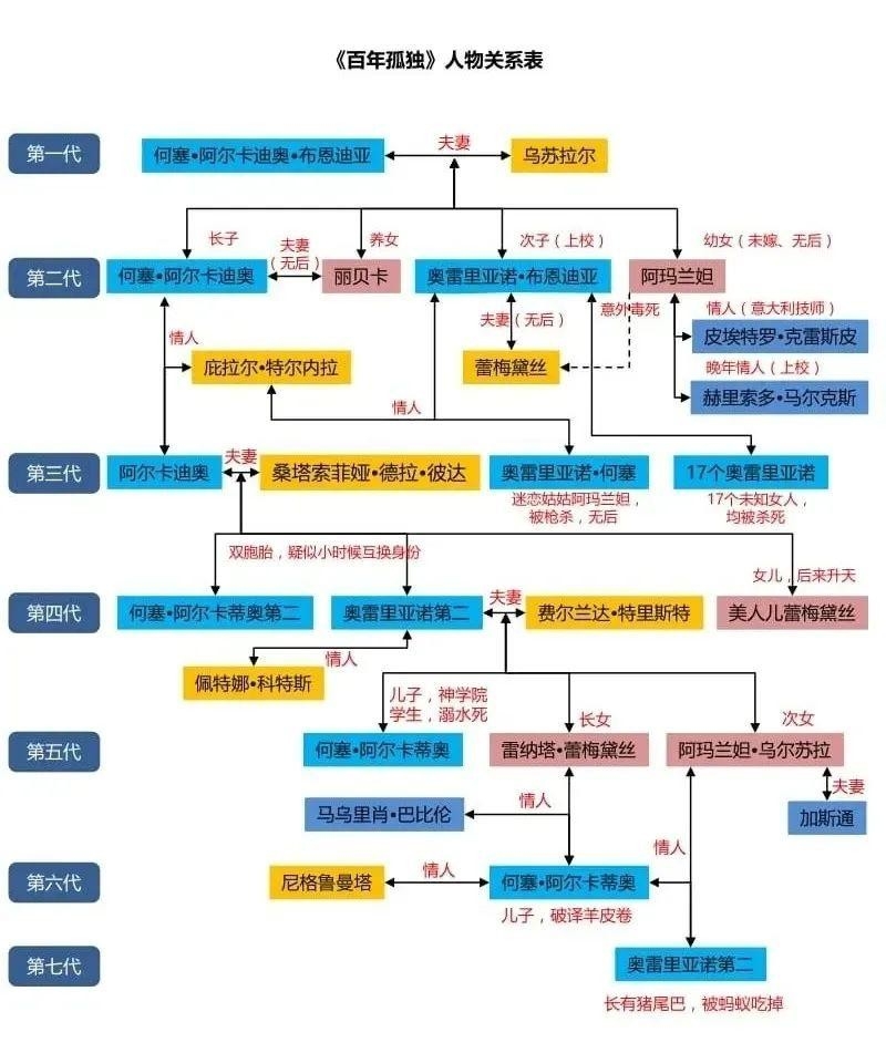 百年孤独里的人物都有重名,比如老何塞和儿子孙子都用相近的同一个名字,看到100多页时,人物有些记不住,睡前理了个人物关系表来。