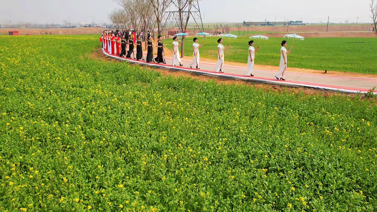 航拍河北邢台万亩油菜花旗袍秀 3月21日拍摄河北邢台万亩油菜花海