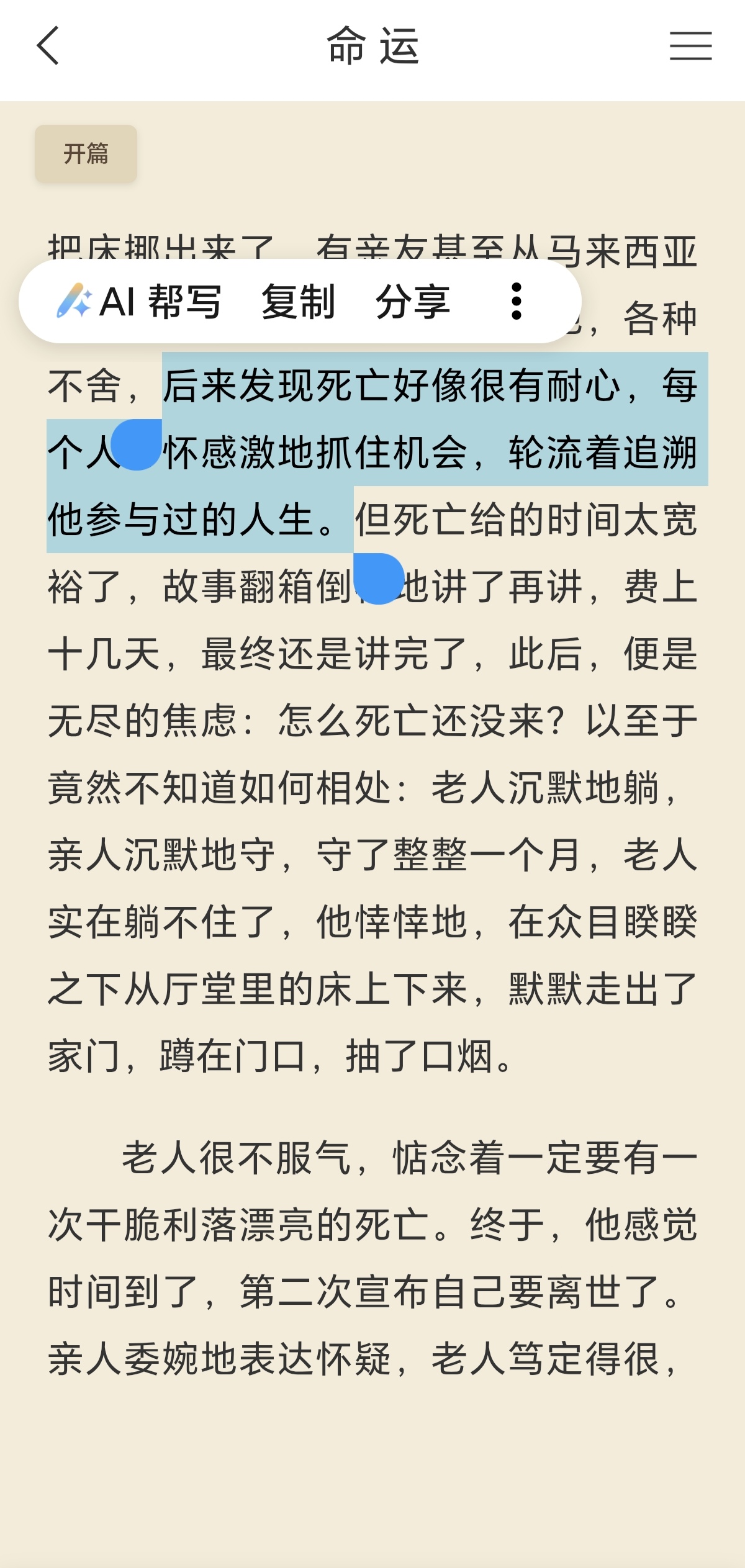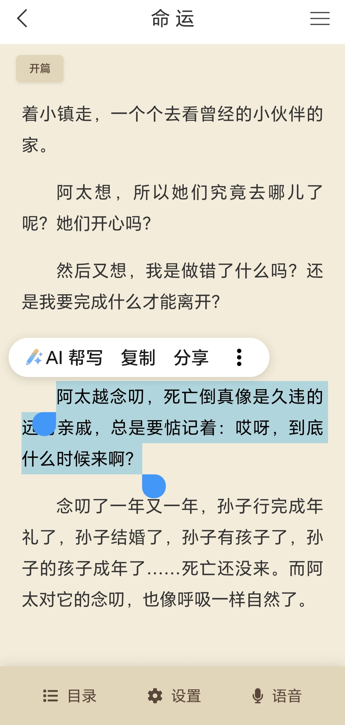 美好又忙碌的四月第一天,开始阅读蔡崇达的《命运》。 开篇关于死亡的描写瞬间击中了我。蔡崇达没有回避死亡的沉重,却用非常新奇的比喻将其具象化:他笔下的死亡不再是冰冷的概念,而是一位“很有耐心”的老友,会“轮流着追溯他参与过的人生”;又像是久等的亲戚,让人在漫长的等待里生出焦灼与好奇。这句“经历了九十九年,阿太最终什么情绪的佐料都懒得加”,将百岁老人面对生死的通透与淡然写得入木三分,文字细腻到仿佛能触摸到闽南海边那股咸腥又温热的生活质感,让人在震撼中生出一种奇妙的平静。 图片里画蓝线的句子是我觉得写得很棒的句子,和书友们一起分享~