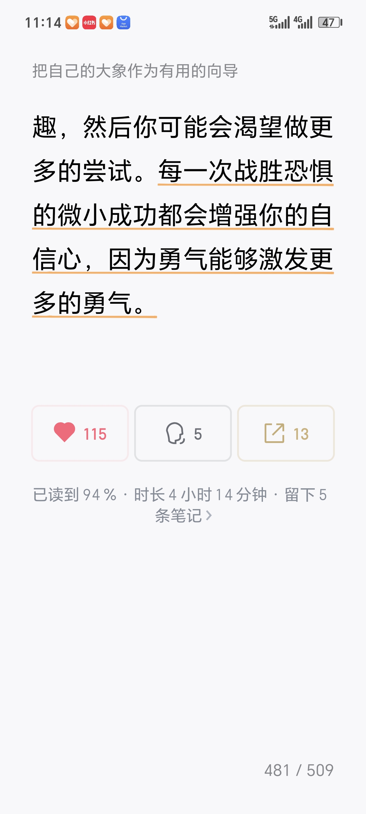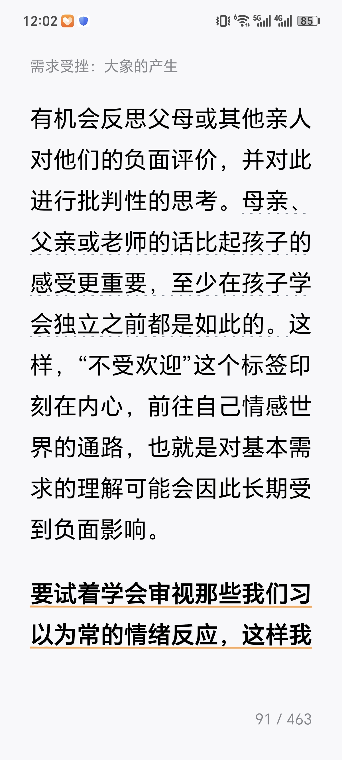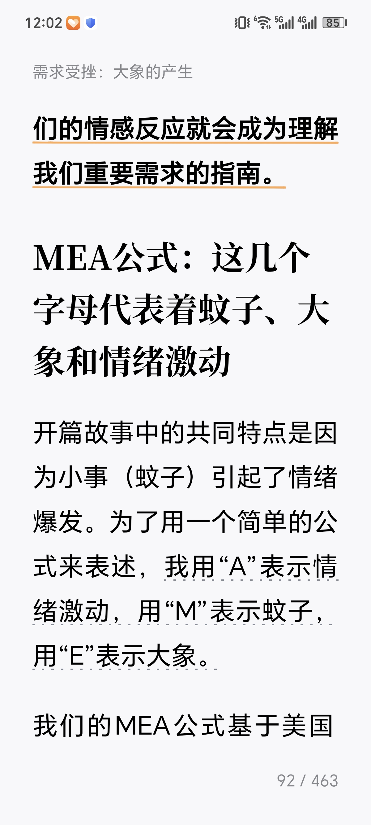 今天看到《躲在情绪后面的大象》第四章"找出你的大象"了。 这一章的核心观点是:表面情绪(如愤怒、焦虑、悲伤)往往只是"蚊子",背后隐藏着更深层的、未被满足的心理需求——这才是真正的"大象"。作者引导读者通过"情绪追踪"技术,层层剥开即时反应,定位那些根植于童年经验或核心信念的深层诉求,比如被尊重、安全感、自主性或价值确认。 我觉得这一章对我的启发在于:它提供了一套从"被情绪控制"转向"与情绪对话"的实用路径。当我们不再急于评判或压抑负面情绪,而是将其视为通往自我认知的路标时,就能获得真正的情绪自主权。这种"溯源式"的自我觉察,不仅能化解当下的情绪困扰,更能帮助我们识别生活中反复出现的模式,从根本上修复内在的需求缺口,建立更强大也是稳定的心理内核。