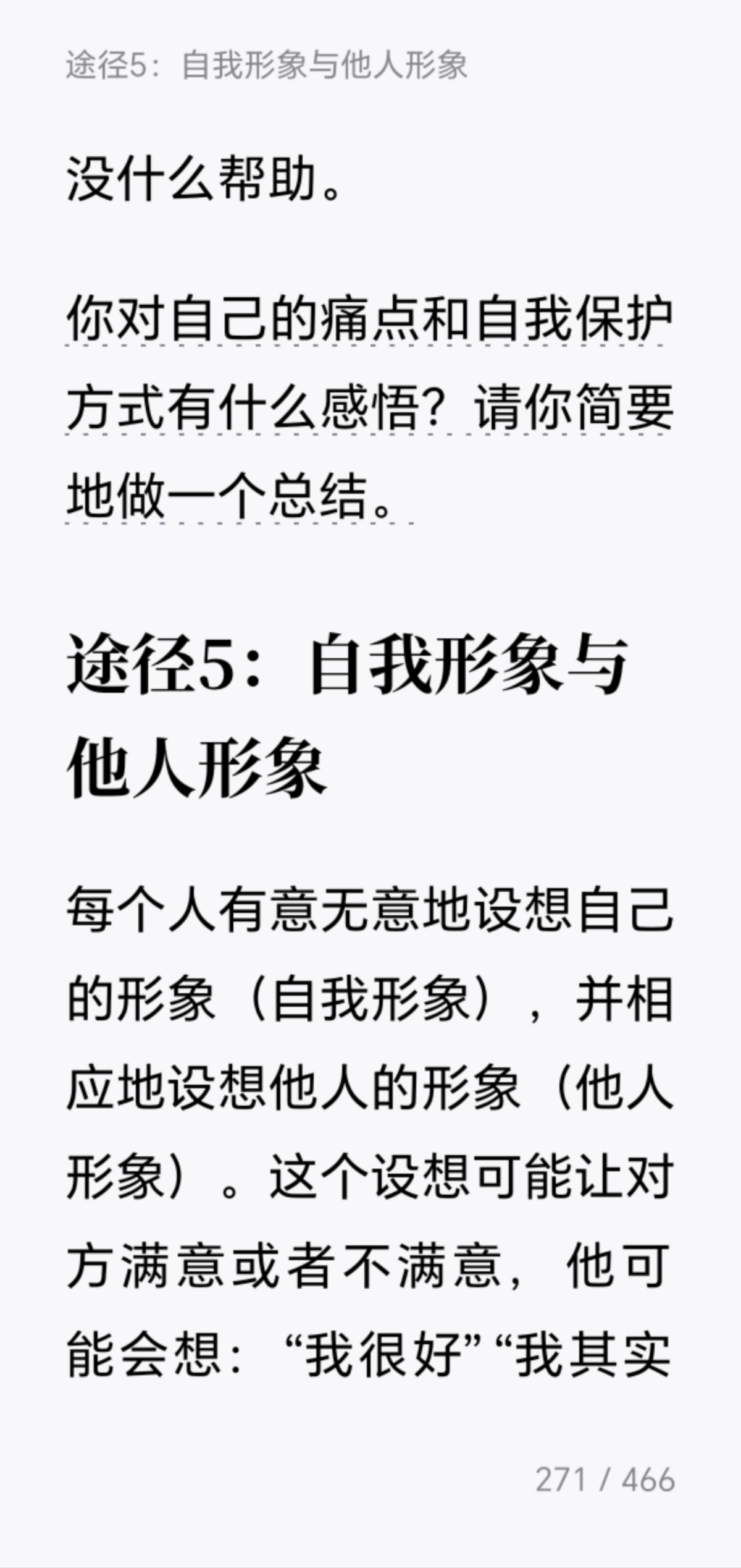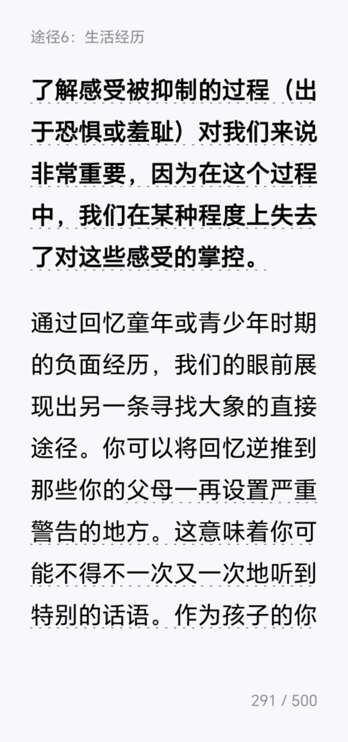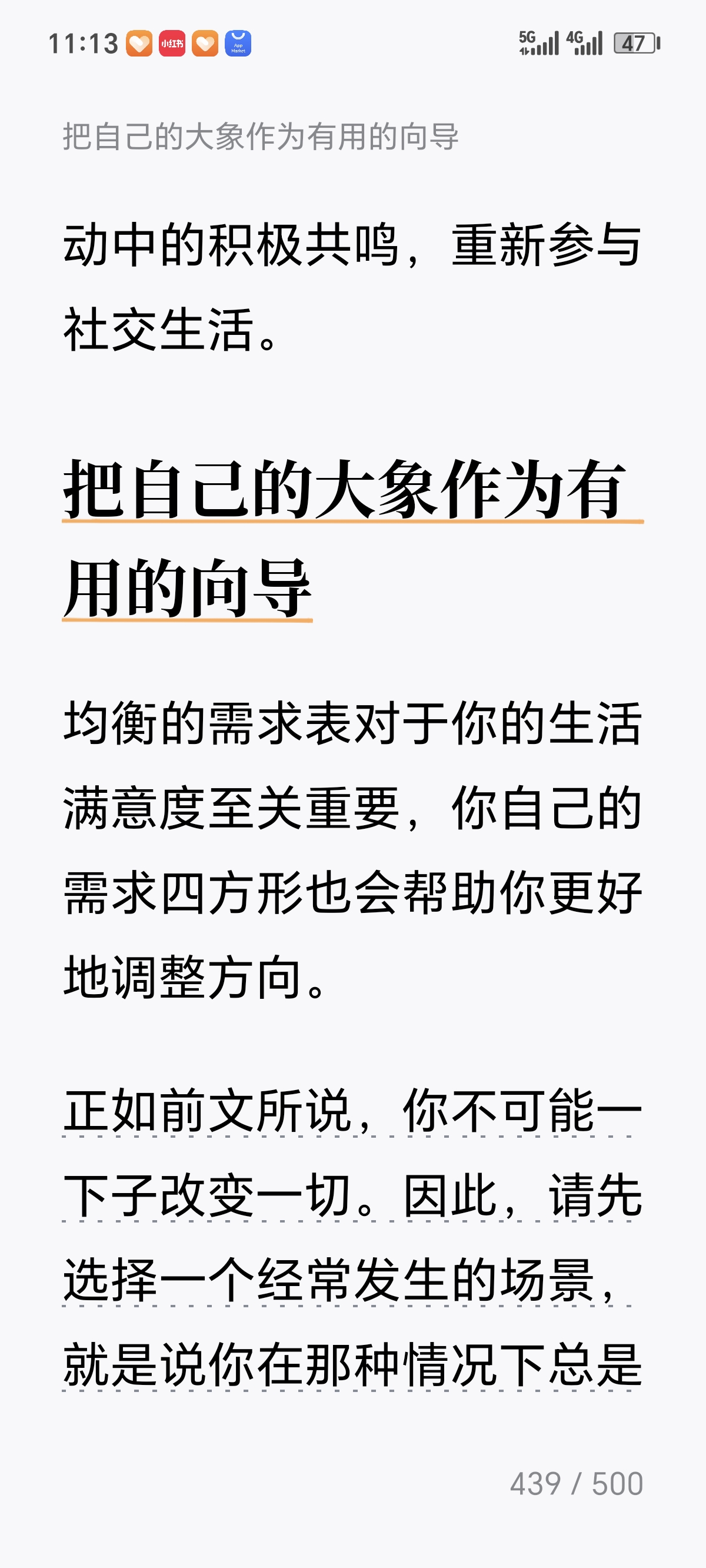 今天看到《躲在情绪后面的大象》第四章"找出你的大象"了。 这一章的核心观点是:表面情绪(如愤怒、焦虑、悲伤)往往只是"蚊子",背后隐藏着更深层的、未被满足的心理需求——这才是真正的"大象"。作者引导读者通过"情绪追踪"技术,层层剥开即时反应,定位那些根植于童年经验或核心信念的深层诉求,比如被尊重、安全感、自主性或价值确认。 我觉得这一章对我的启发在于:它提供了一套从"被情绪控制"转向"与情绪对话"的实用路径。当我们不再急于评判或压抑负面情绪,而是将其视为通往自我认知的路标时,就能获得真正的情绪自主权。这种"溯源式"的自我觉察,不仅能化解当下的情绪困扰,更能帮助我们识别生活中反复出现的模式,从根本上修复内在的需求缺口,建立更强大也是稳定的心理内核。