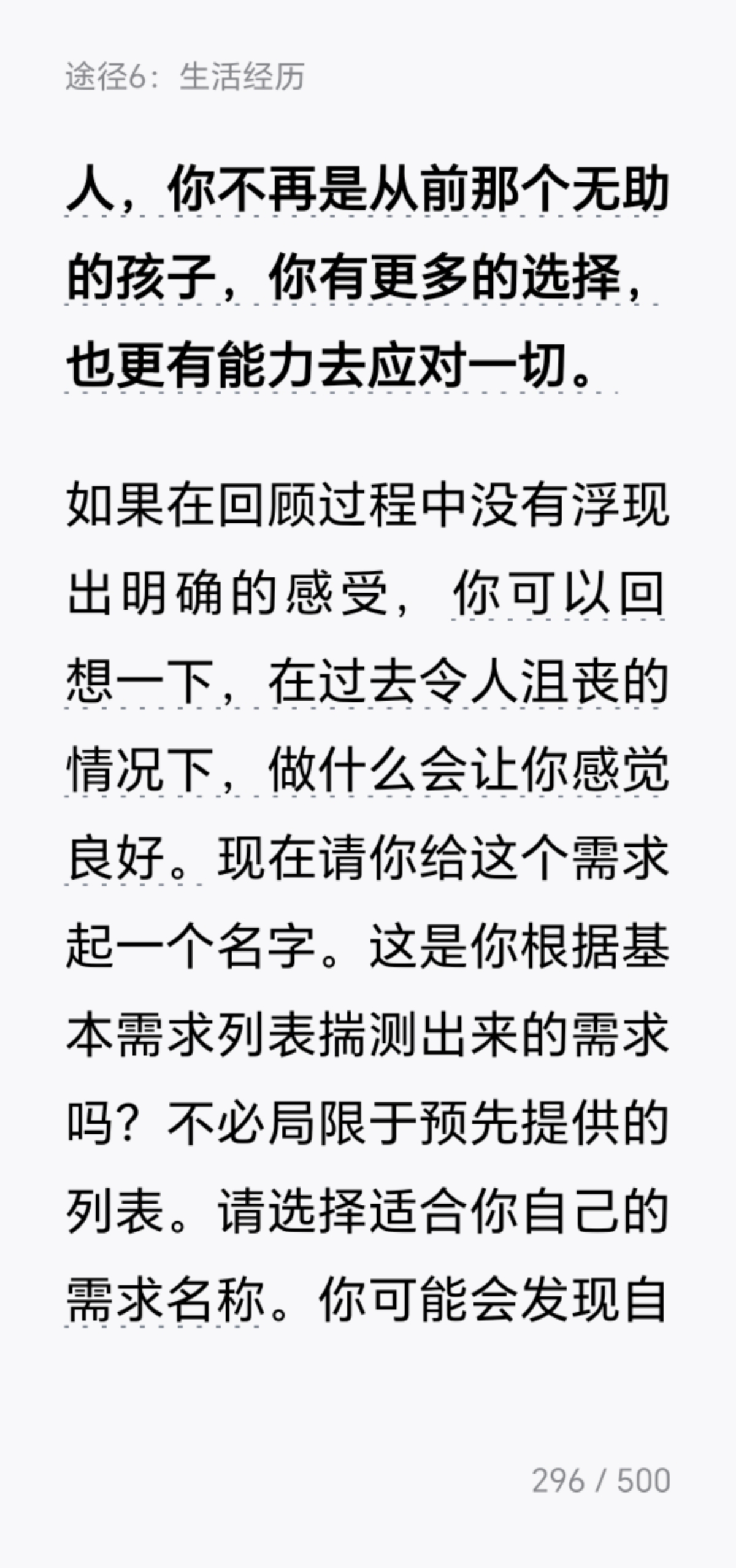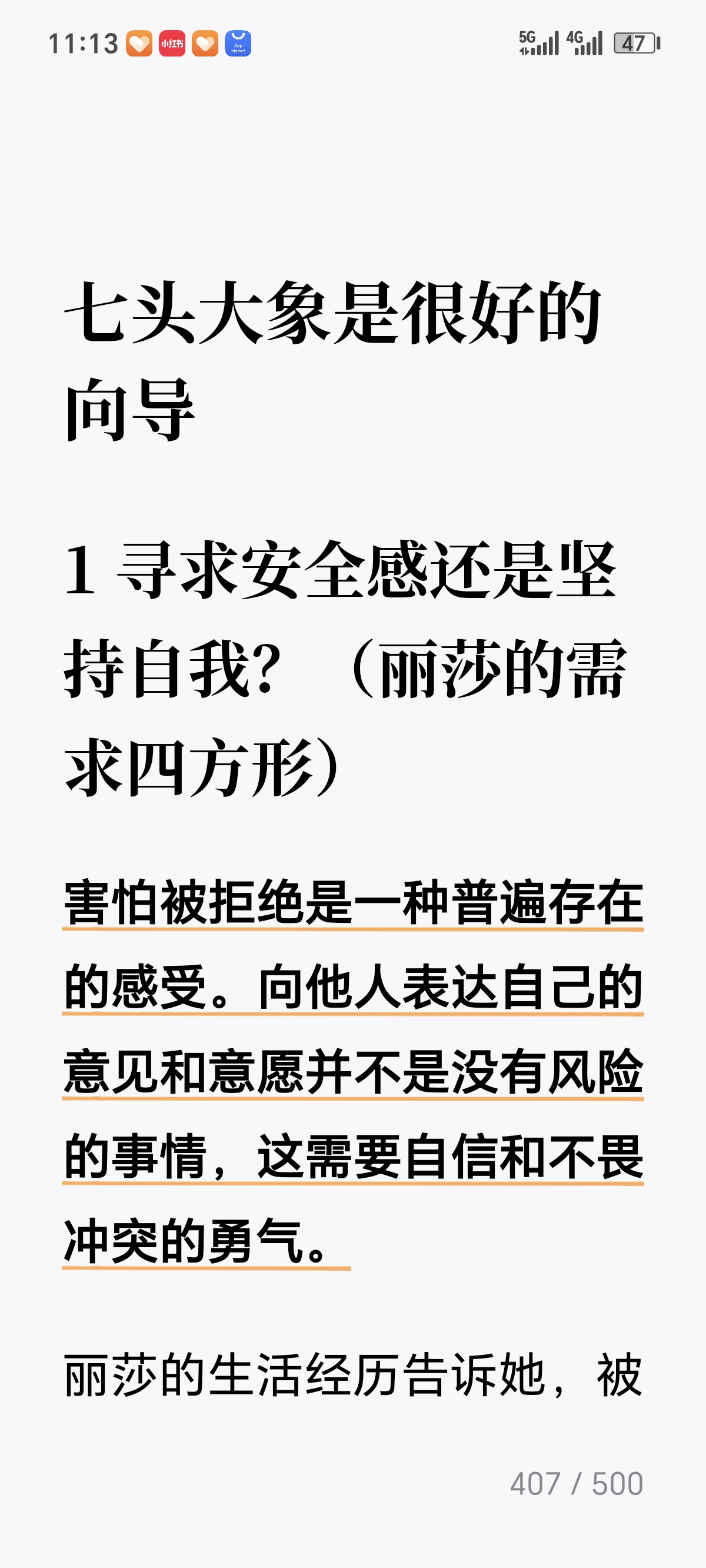 今天看到这本书的第三章了:"追踪痕迹:你了解自己的基本需求吗?" 这一章通过一系列自我审视的引导问题,带领读者检视稳定的人际关系、被重视和受关注、平等待遇和公平、情欲和性欲、安全感、好奇心、独立自主这七大基本心理需求,帮助读者回顾生活经历中哪些需求长期被忽视或未得到满足,对后续找出自己的"大象"很有启发和帮助。作者基本上先讲理论,后面再用具体例子进行分析。