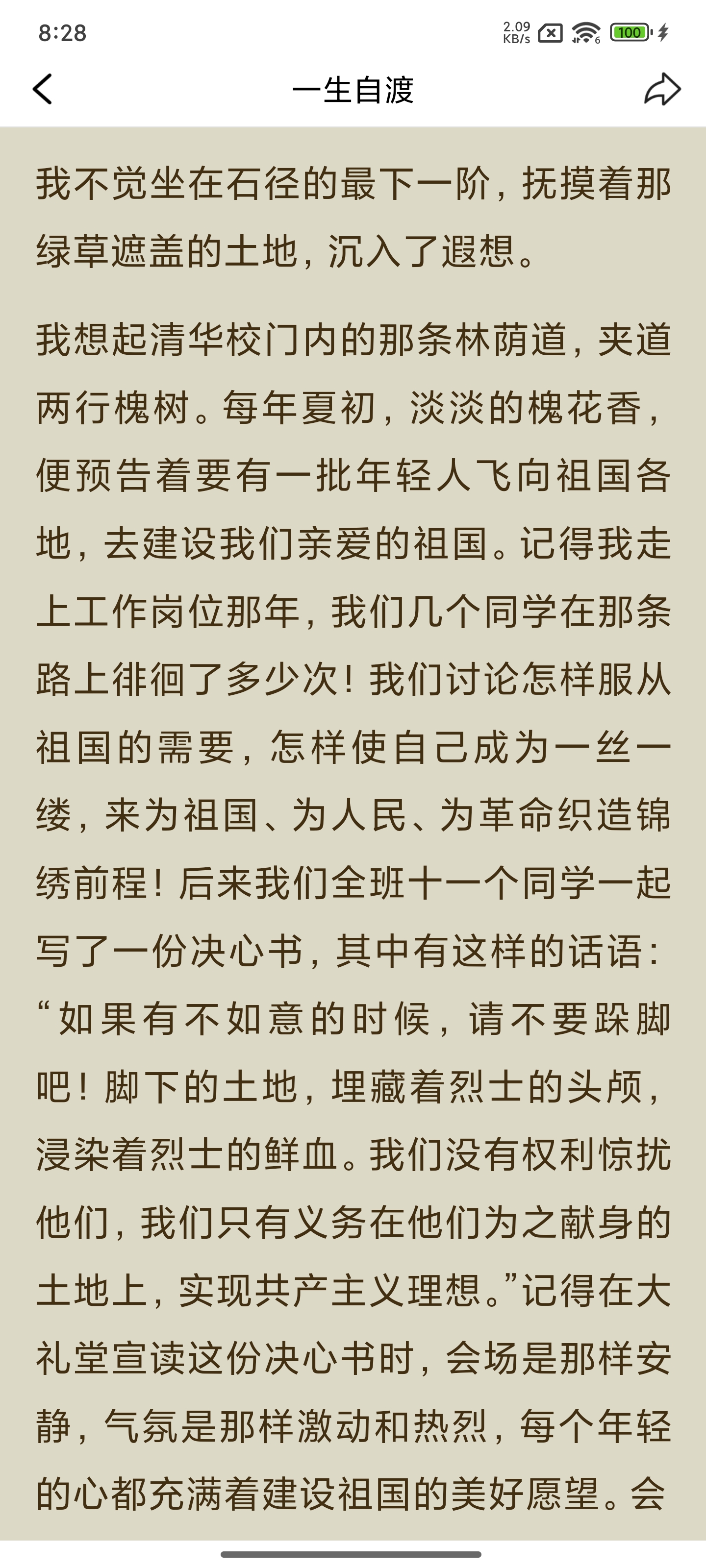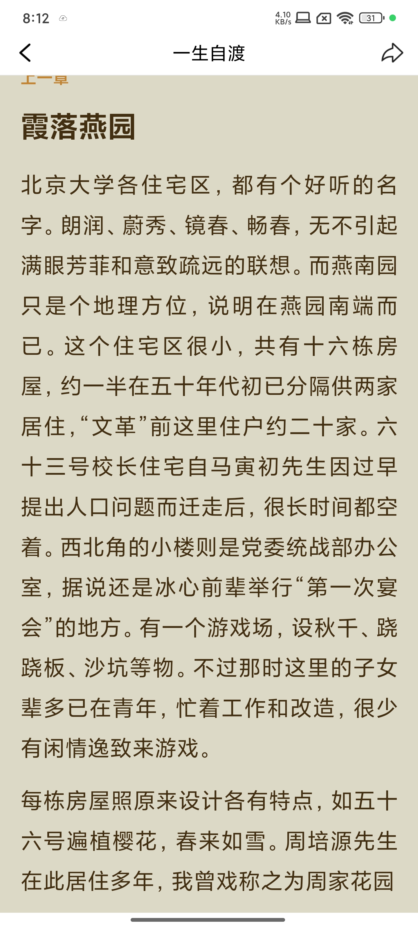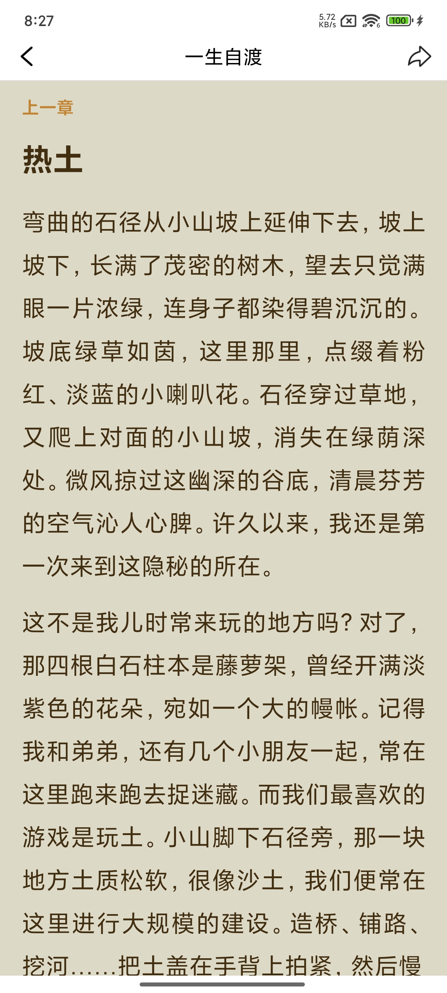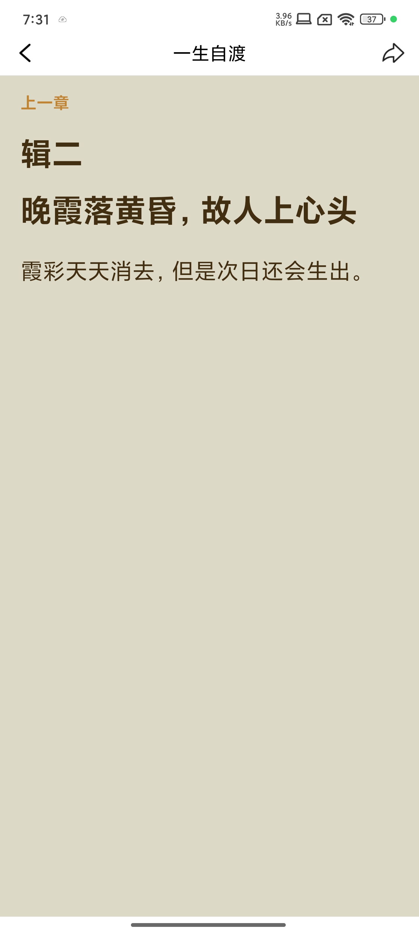 今晚《一生自渡》看到第三辑,文字中多了一点轻松惬意。我有时会偶尔觉得看电子书让我很匆忙,心里不踏实,总怕记不住的一些细节,想再回翻的时候找不到。可能是我个人的问题,总感觉电子书不能像纸书那样随时勾画喜欢的句子,随笔写一些小感想。不知道有没有同感的朋友?