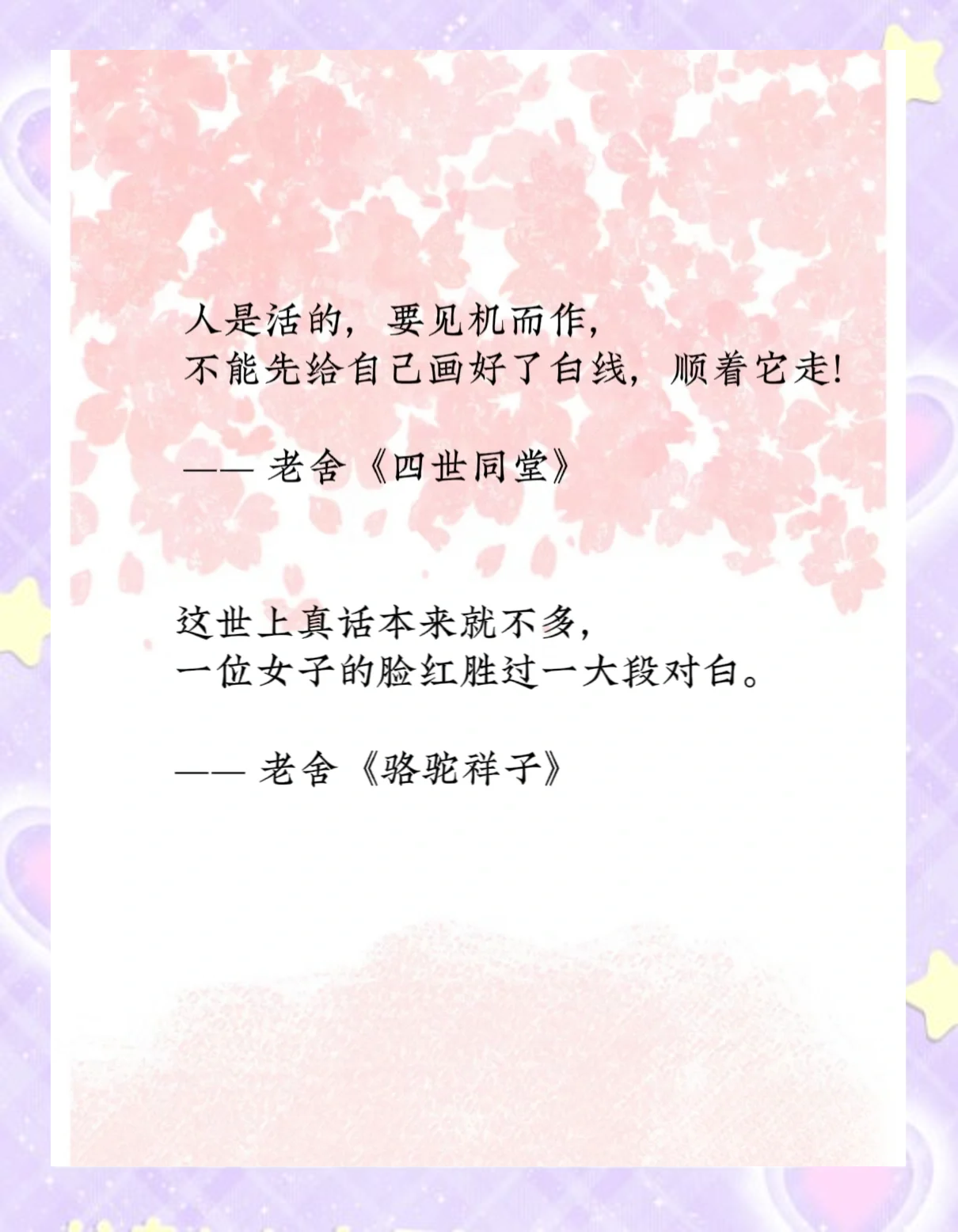 老舍先生的散文之所以“通透人心”,正因为他扎根于生活本身,用最朴素的语言,写最真实的人情冷暖。 他不是高高在上的文人,而是蹲在胡同口、坐在茶馆里、走在市井中的观察者与亲历者。他的文字没有华丽辞藻堆砌,却如清泉入心。