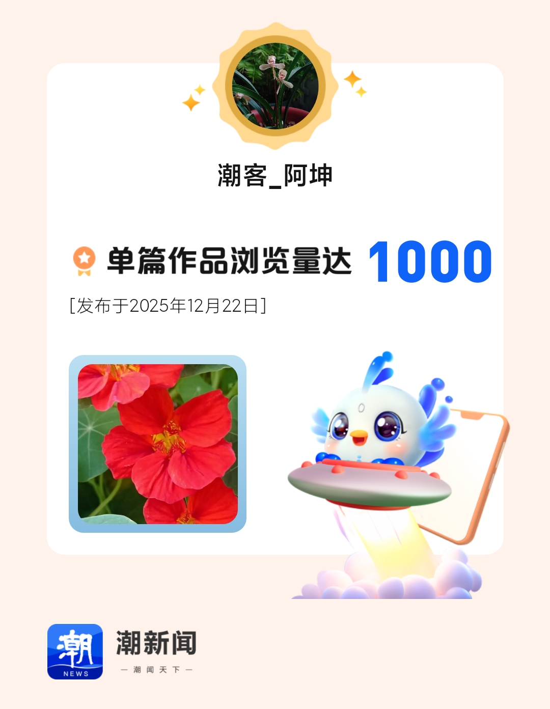 我在潮新闻发表的单篇作品浏览量达到1000!