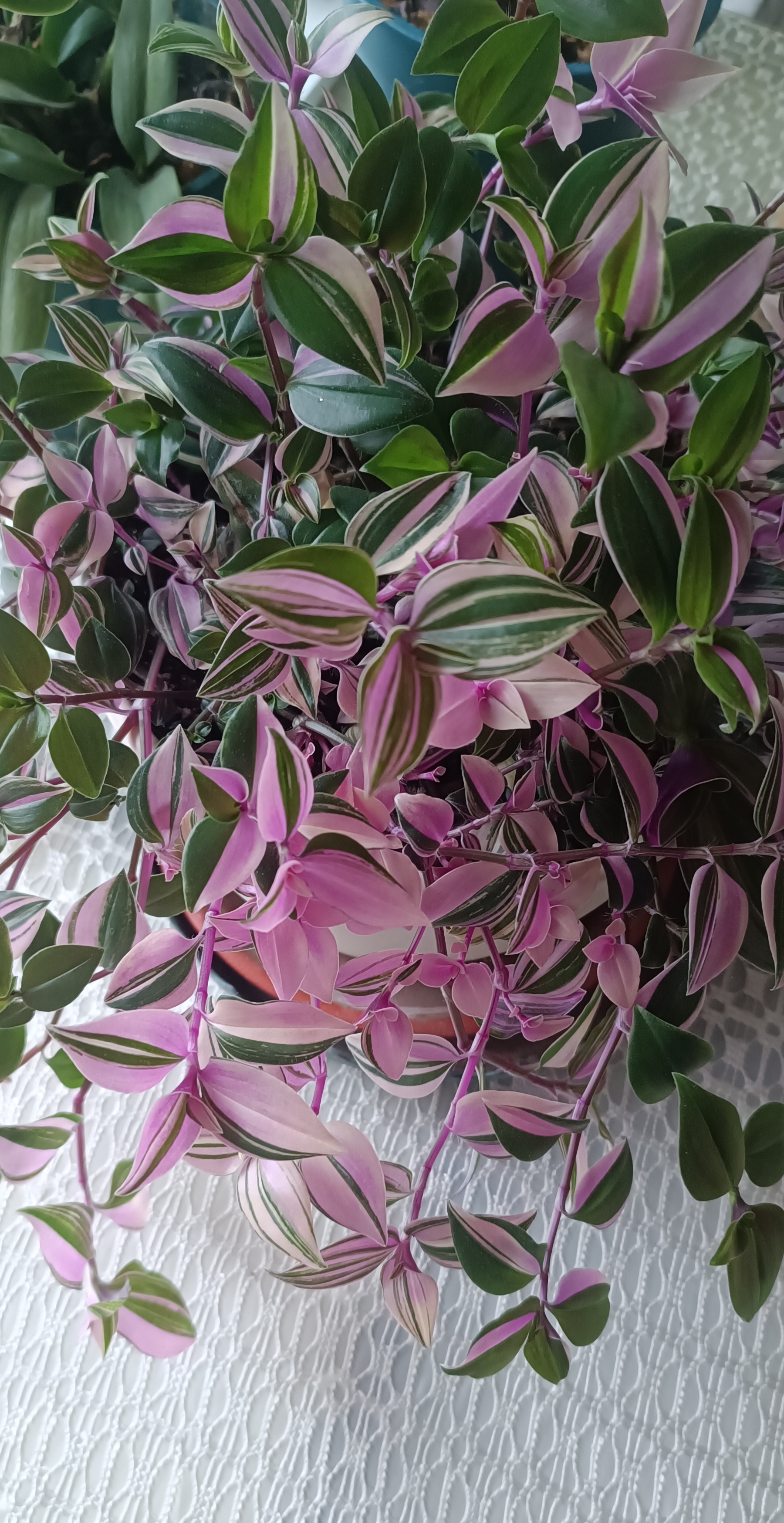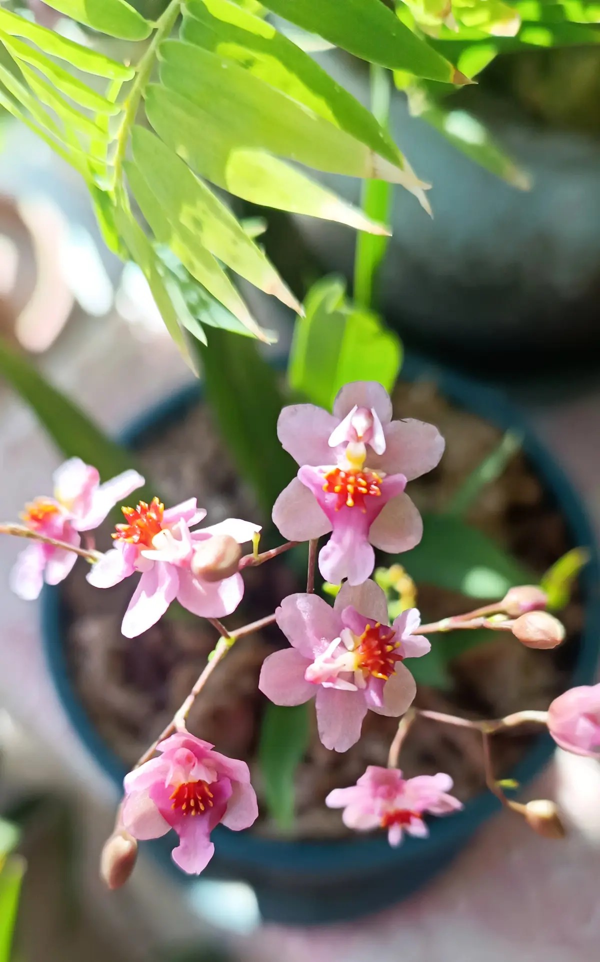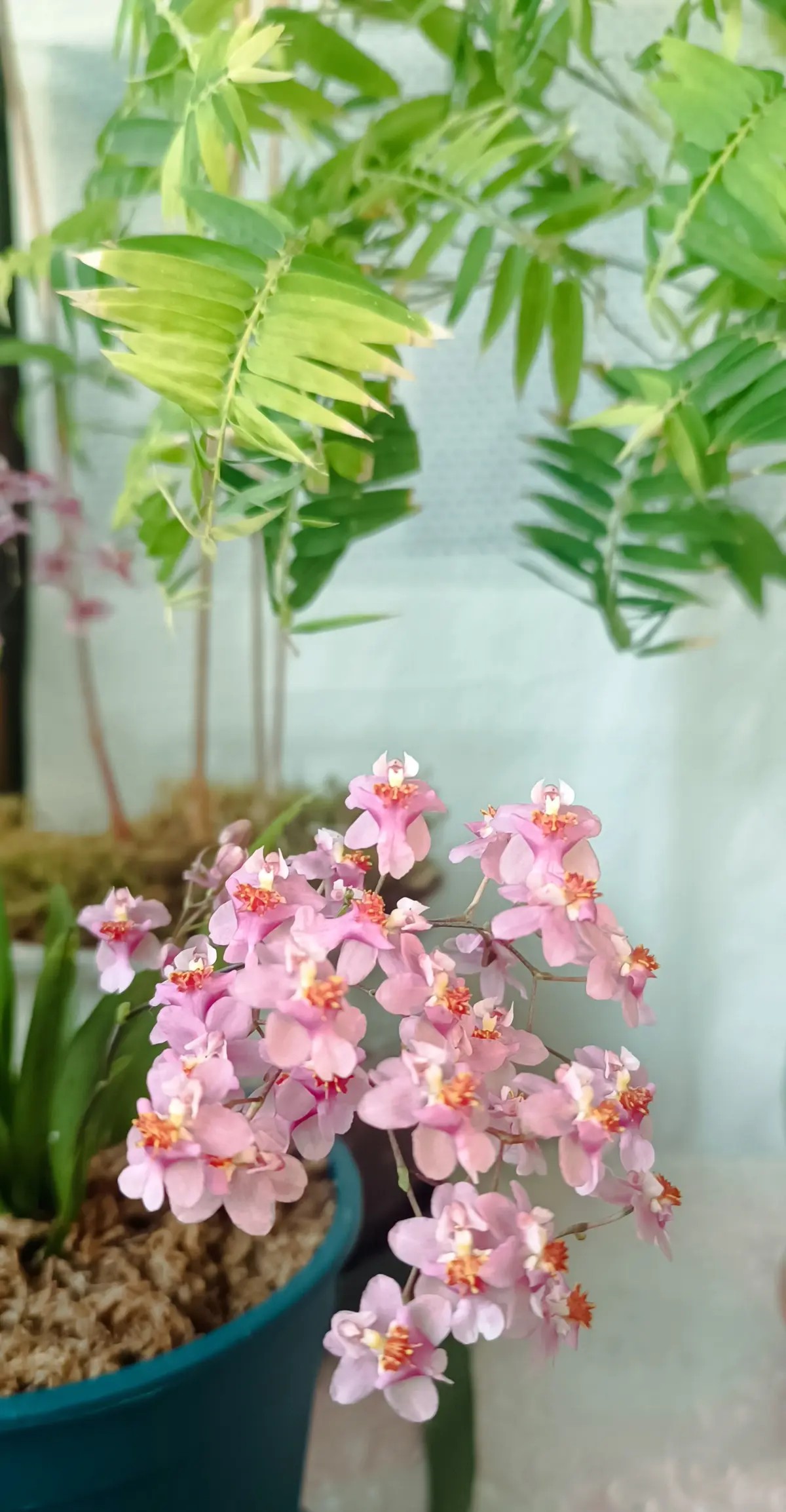 梦香文心兰开了 清晨,一缕缕淡淡的奶香味飘来,不觉让人心里甜滋滋的。2024年买来的文心兰又开了。 梦香文心兰,多好听的名字。 晨光中,俏皮的粉嫩色小花簇拥在一起,你挤着我,我挤着你,如一群青春而富有活力的少女,清纯、甜美。 正午的时候,我习惯把窗户打开,风顺势而入,吹动绿色的竹,轻摇着竹下的文心兰,彼此映衬,别有情趣。 或动,或静,都是靓丽的风景。