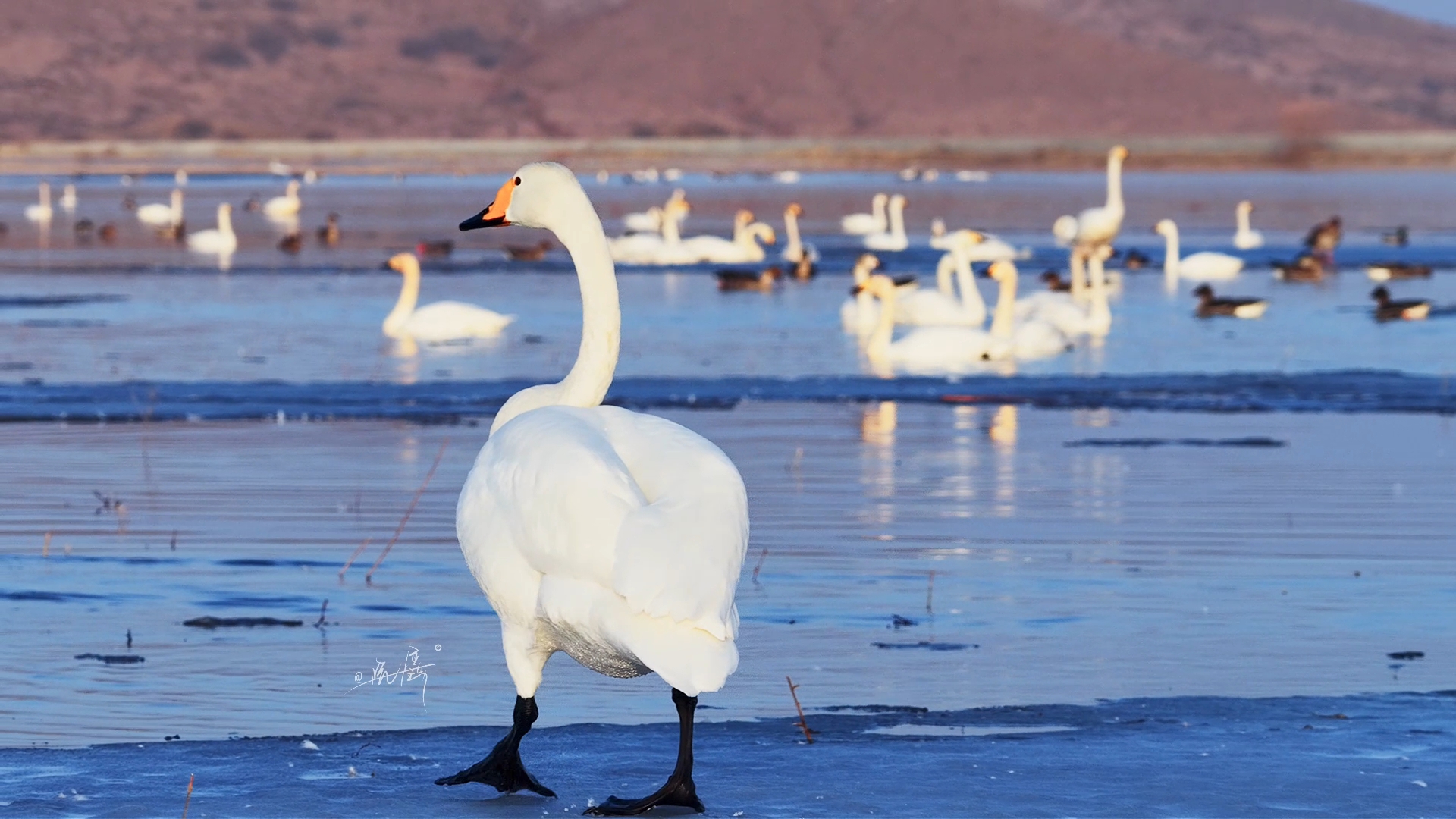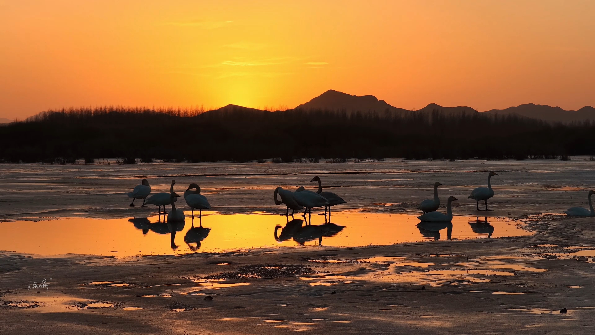 日暮时分,在西拉木伦河沿岸,北归的天鹅群洗梳着羽毛。