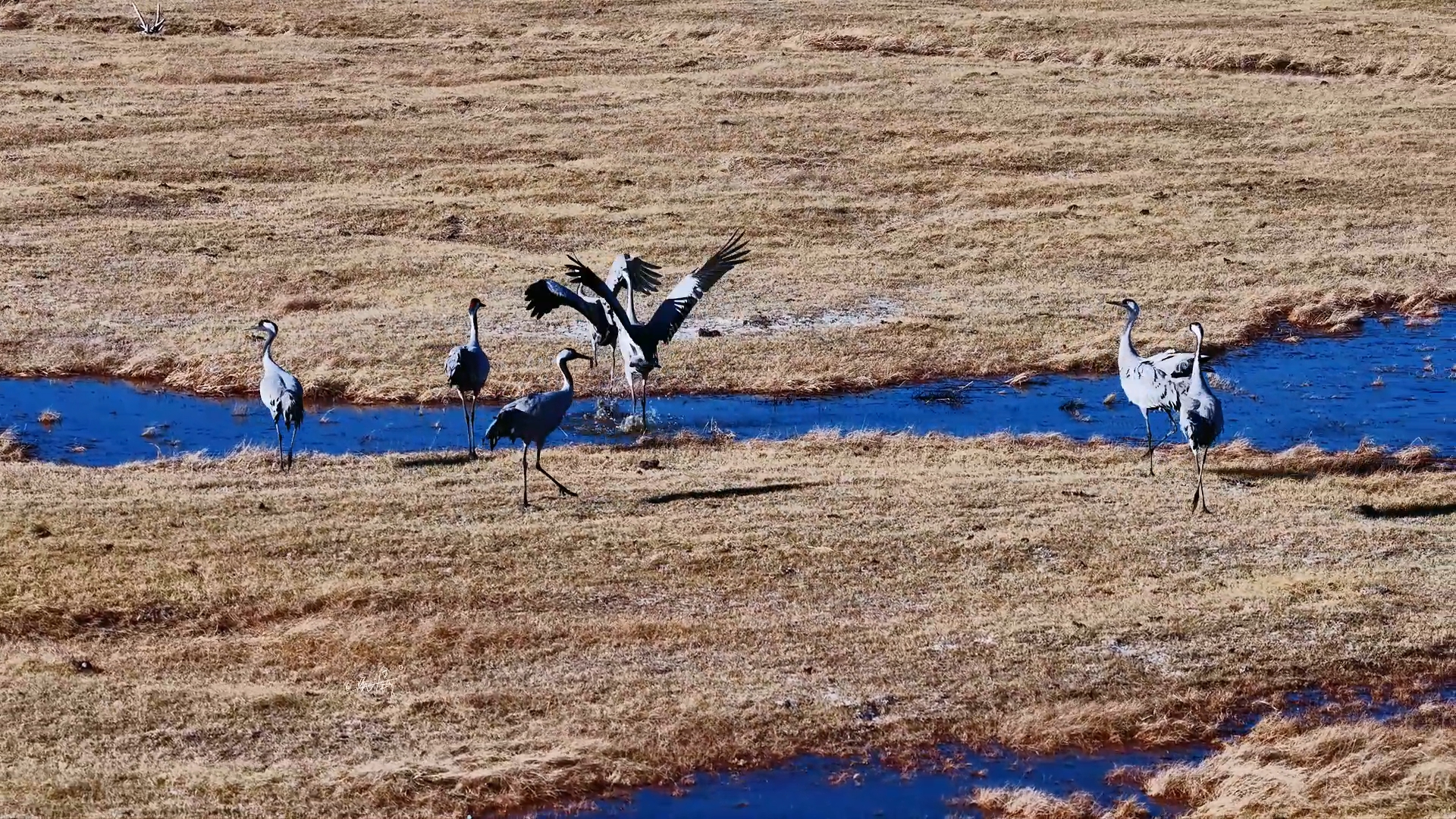 初春时节,候鸟北归,赤峰市阿鲁科尔沁旗湿地于4月2日,观测到今年首批归来的灰鹤。成群灰鹤翩跹而至,嬉戏打闹,为湿地增添勃勃生机。