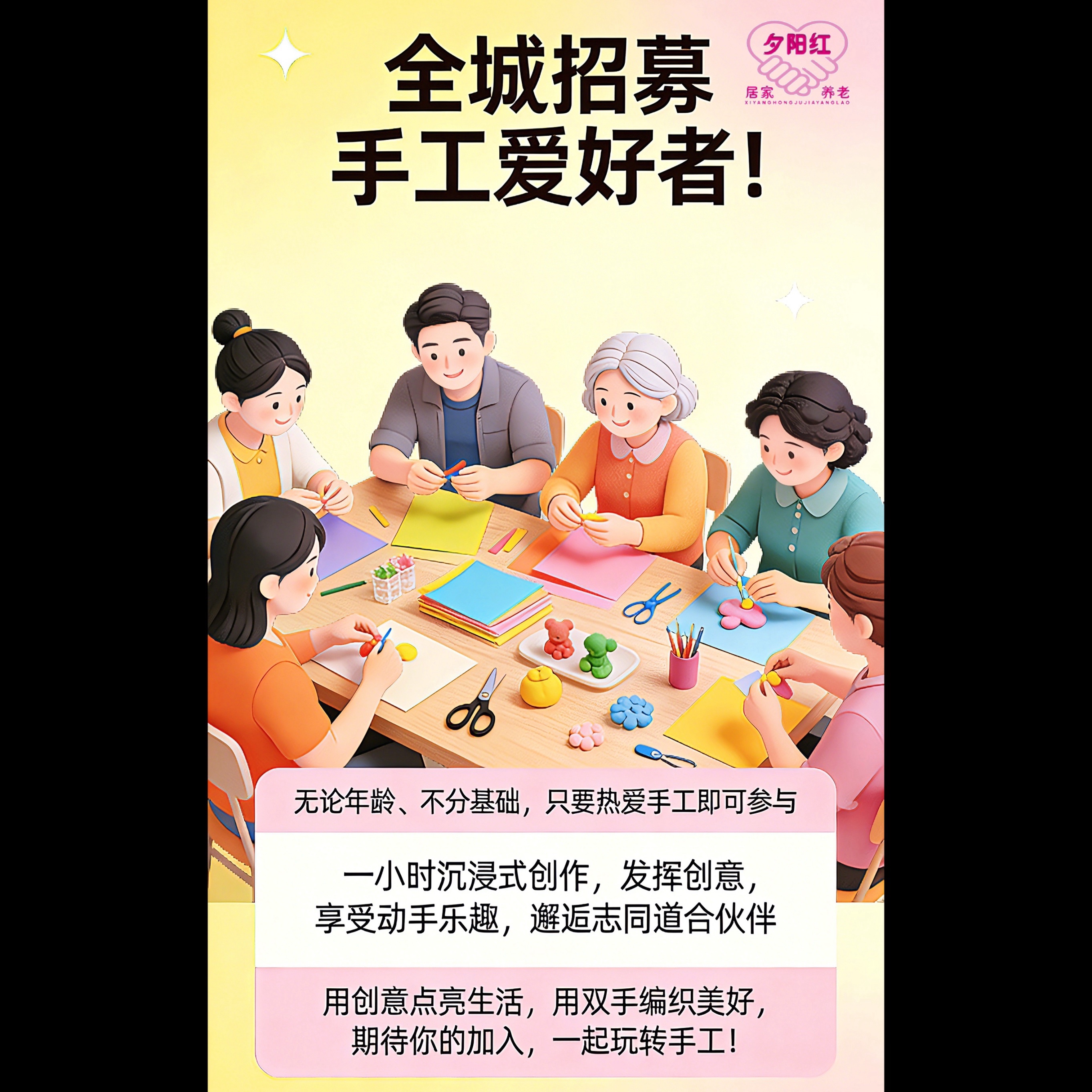 ❤️ 全城招募手工爱好者!夕阳红免费开放手工体验活动!现场做成品🉑带走!无论年龄、不分基础,只要你热爱手工,就有机会参与。一小时沉浸式创作,尽情发挥创意,享受动手的乐趣,邂逅志同道合的伙伴。用创意点亮生活,用双手编织美好,期待你的加入,一起玩转手工!地点在上城区凯旋街道的凯益荟,具体可私信